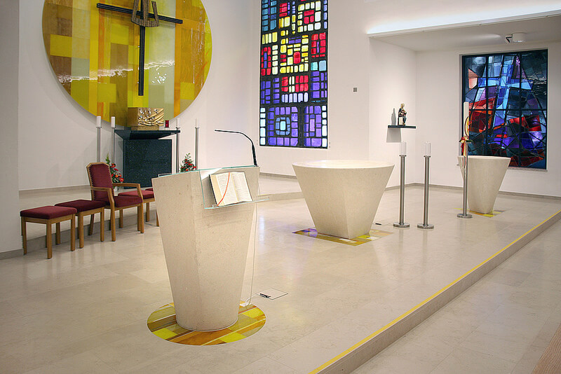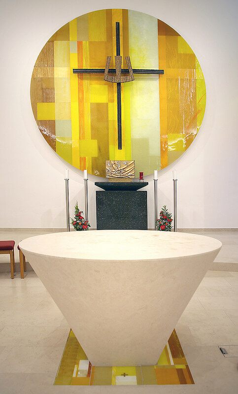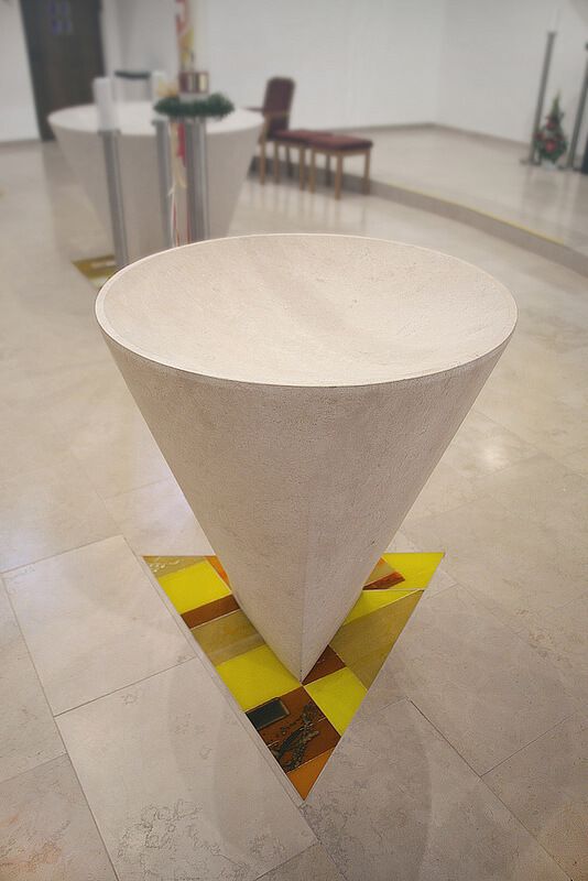 Der Entwurf vom Künstler Mag. Heinz Ebner lautet „Wandlung - aus Alt wird Neu, aus Eckig wird Rund“ – das spiegelt sich bei den Formen des Altars, Ambos und Taufbeckens wider. Der Altar hat eine elliptische Form und verjüngt sich auf eine rechteckige Standfläche. Der Ambo mit seiner rechteckigen Form geht in eine kreisförmige Standfläche über und das Taufbecken verjüngt sich mit seiner Kreisform zu einer dreieckigen Standfläche. Die Rohlinge wurden mit einer Brückensäge gefertigt und die finale Formgebung erfolgte durch Handarbeit.