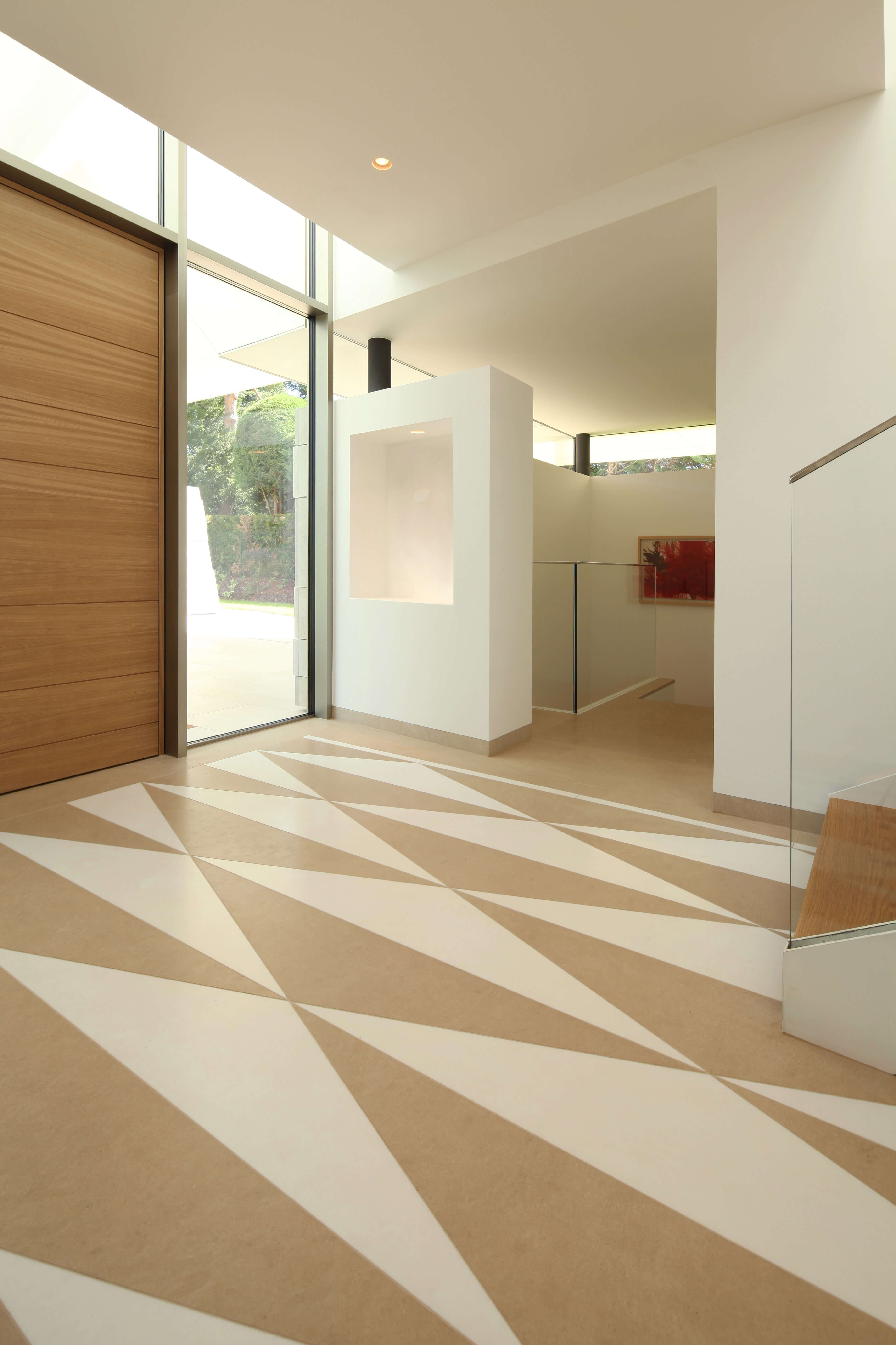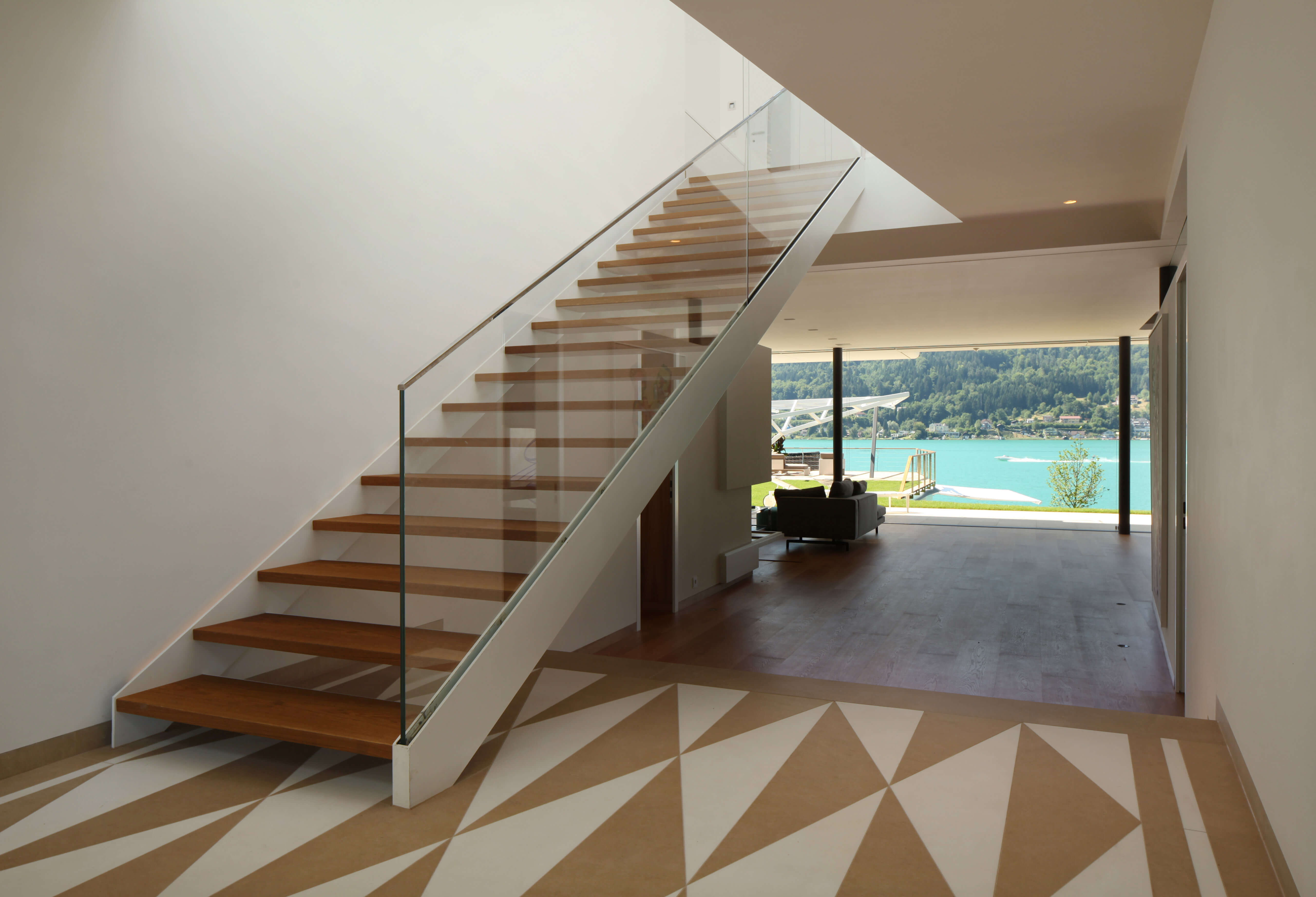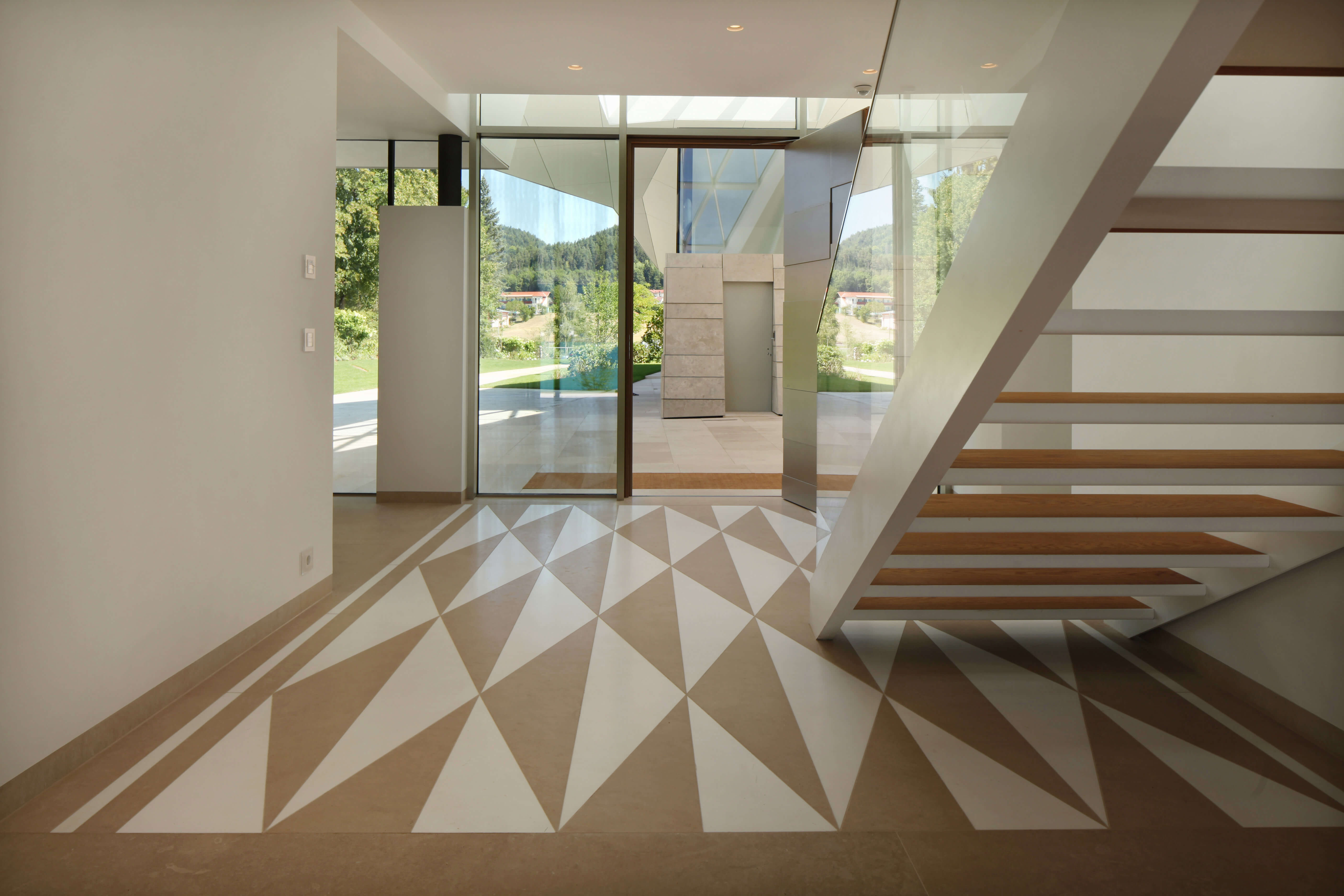 Im Eingangsbereich der Villa am See zitieren die Architekten Gestaltungselemente des Daches, das zugleich das obere Wohngeschoß umschließt. Die glatte, mit weißen Platten bekleidete Außenhülle wird durch ein feines Trapezmuster aus spitz- und stumpfwinkligen Fugen gegliedert. In reduzierter Form wiederholt sich dieses Muster im Bodenbelag des Foyers: Weißer Thassos-Marmor und hellbrauner Avorio Kalkstein bilden ein strenges geometrisches Raster aus spitzwinkligen Dreiecken. Von diesem Podest aus erschließen sich die Wohnräume des Erdgeschosses sowie die Schlafräume im oberen Stockwerk. Für den Betrachter formen die Dreiecke jeweils drei "Bahnen" oder Blickrichtungen: schräg nach links in Richtung der Treppe, schräg nach rechts sowie als Achse zur zum See geöffneten Wohnhalle. Die beiden Farben des Bodenbelags korrespondieren mit der weißen Wand sowie dem Braun der massiven Holzstufen. Die Reduktion auf zwei Grundtöne steigert die Wertigkeit und Wirkung der Naturmaterialien.