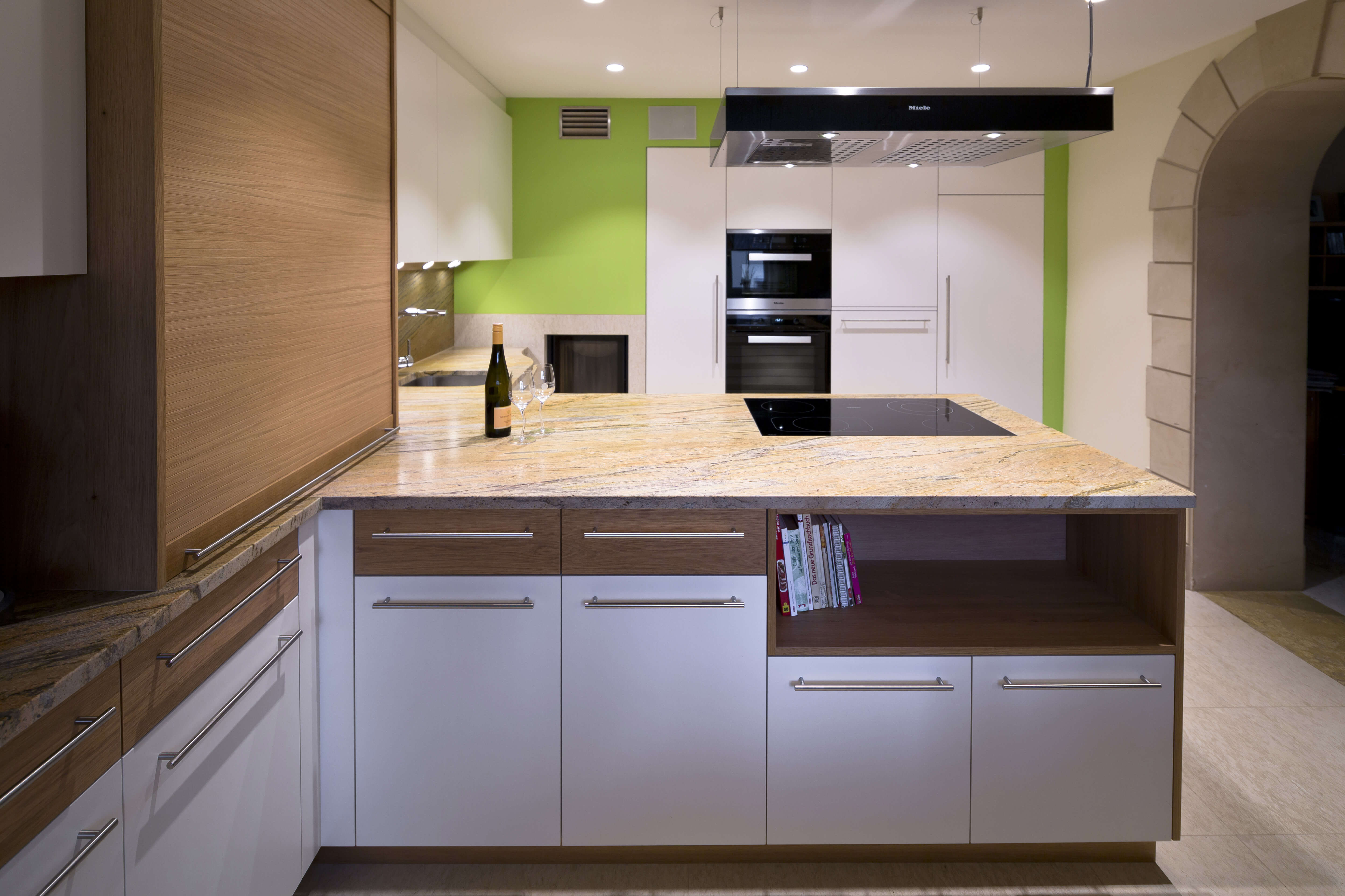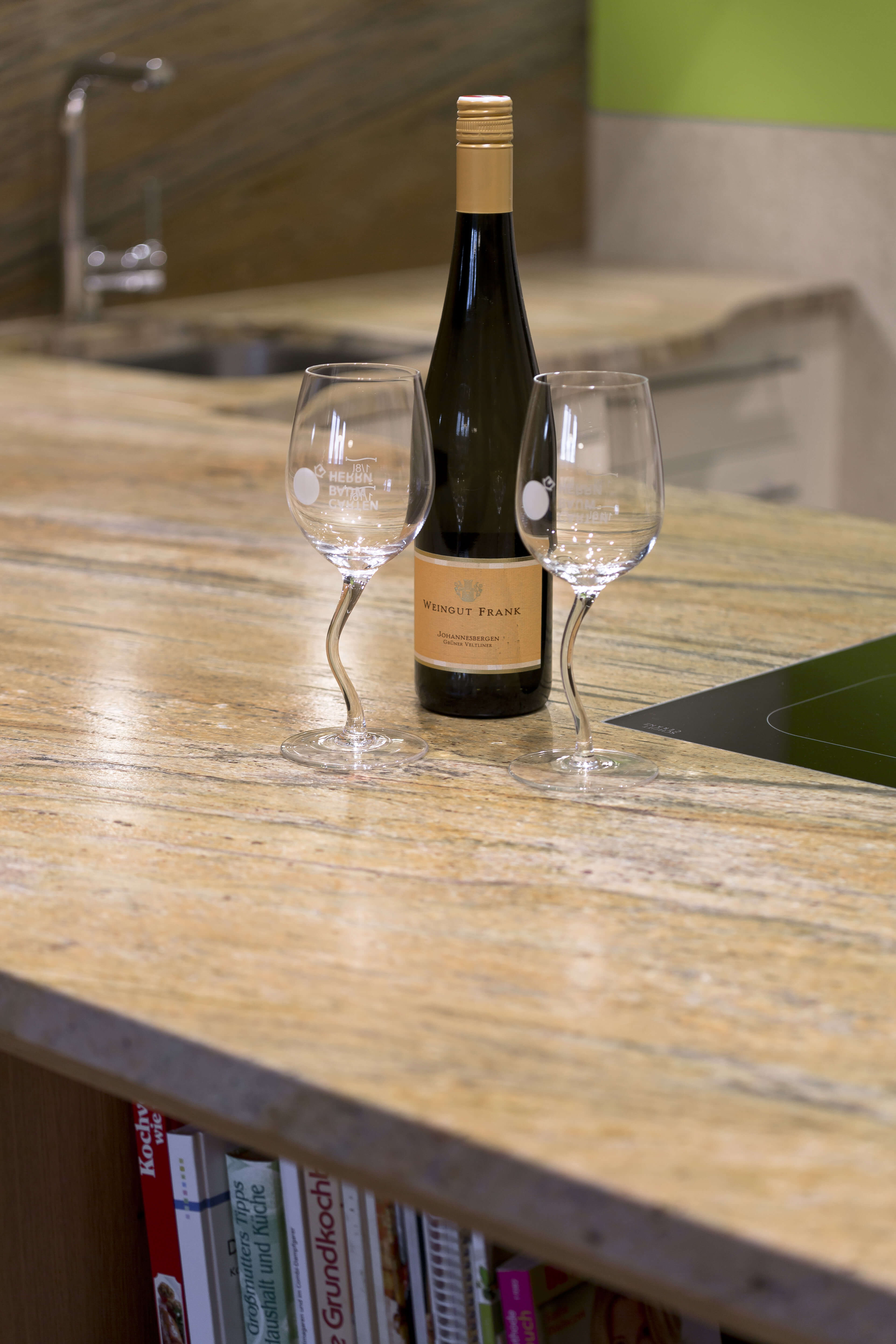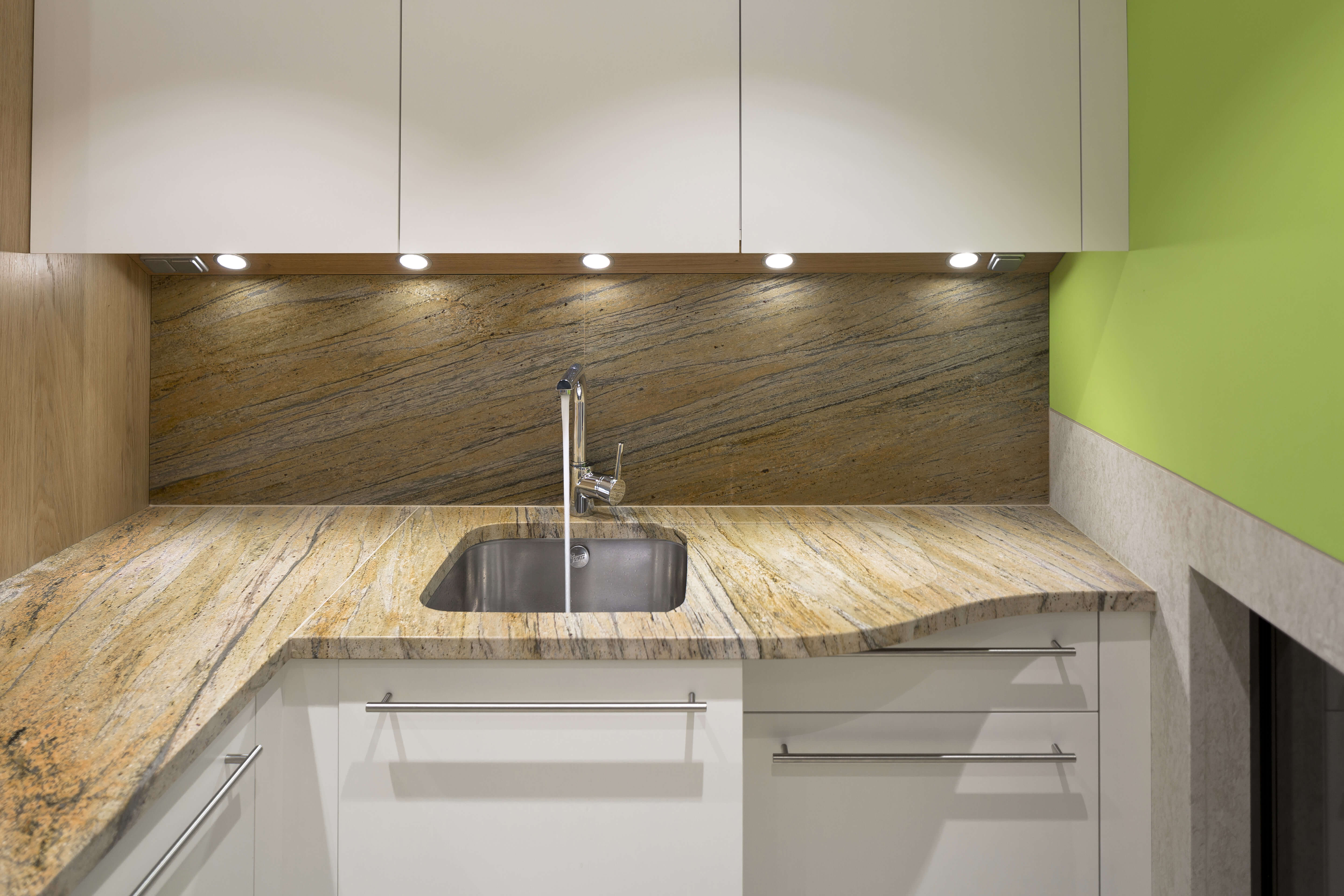 In einem Privathaus im Weinviertel sollte die bestehende Küche durch ein modernes Ambiente mit Naturstein ersetzt werden. Bei der Gestaltung setzten Schreiber & Partner Küche auf die freundliche, helle Wirkung von Praha Gold. Die 3 cm starken Platten sind gebürstet. Im Gegensatz zu polierten Platten lässt diese samtig schimmernde, leicht strukturierte Oberflächenbearbeitung die Arbeitsplatten besonders natürlich wirken. Die Rückwand mit den integrierten Elektrogeräten steht dazu in einem klaren Kontrast, ohne die optische Wirkung der Steinplatten zu beeinträchtigen. In die Rückwand ist ebenfalls ein mit Kalkstein bekleideter Kamin eingebaut, der die wohnliche Atmosphäre des Raums unterstreicht. Der aus demselben Material gefertigte Kalksteinboden bildet die entspannte Basis des Raumes. Das von einem Lichtplaner entworfene Beleuchtungskonzept wirft ein ausgewogenes Licht auf die gesamte Szenerie.