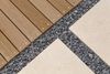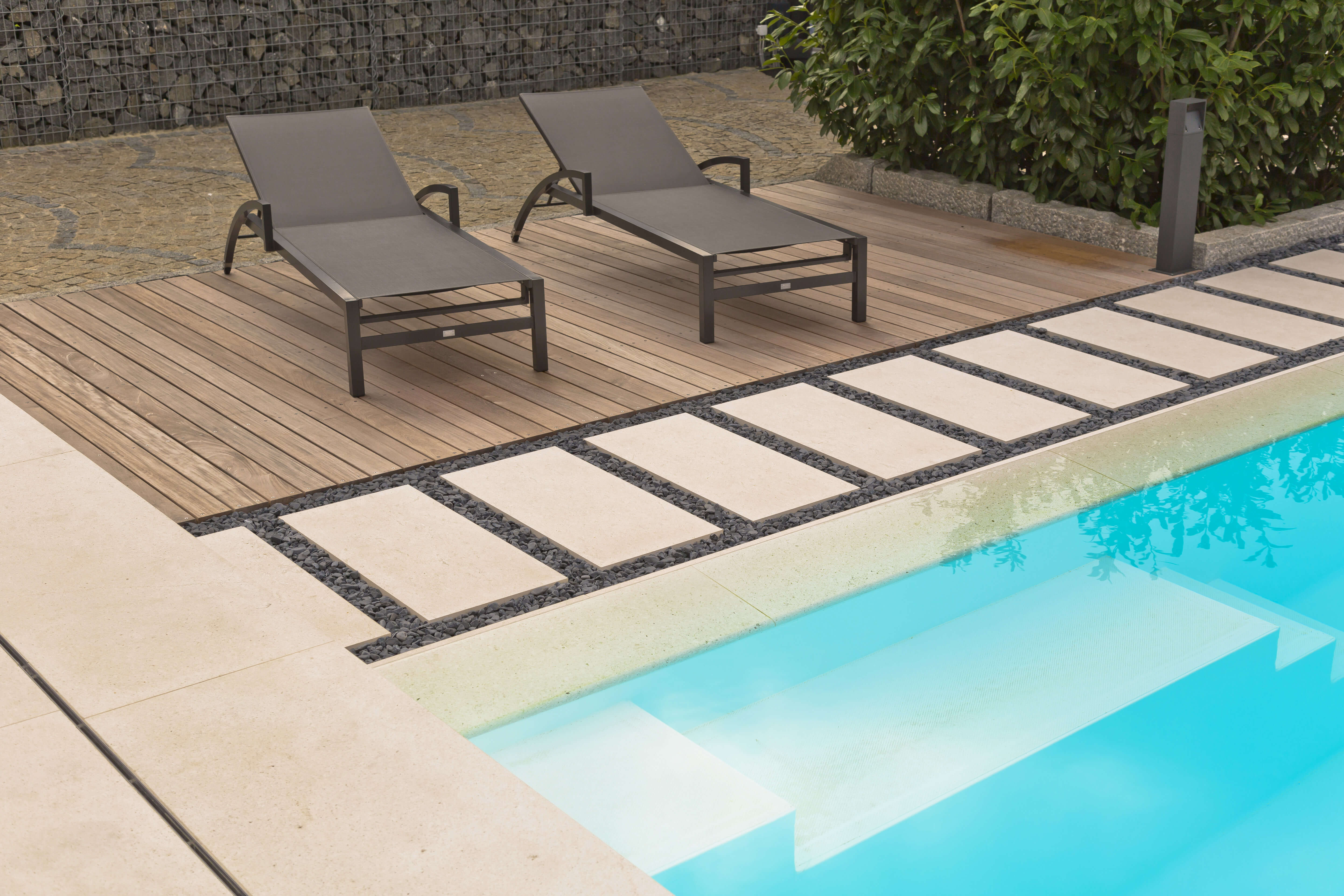 Der Weg an der Langseite des Pools ist mit kontrastierenden, dunkelgrauen Flusskieseln ausgelegt. Diese heben die Trittplatten optisch hervor und bilden zusammen mit der hölzernen Liegefläche einen sachlich-modernen Dreiklang. Die gestrahlte Oberfläche des Kalksteins bietet eine ausreichende Rutschhemmung und ist angenehm barfuß zu begehen. Die anspruchsvoll mit Naturstein bekleideten Überläufe und Rinnen unterstreichen den hochwertigen Eindruck der Anlage.