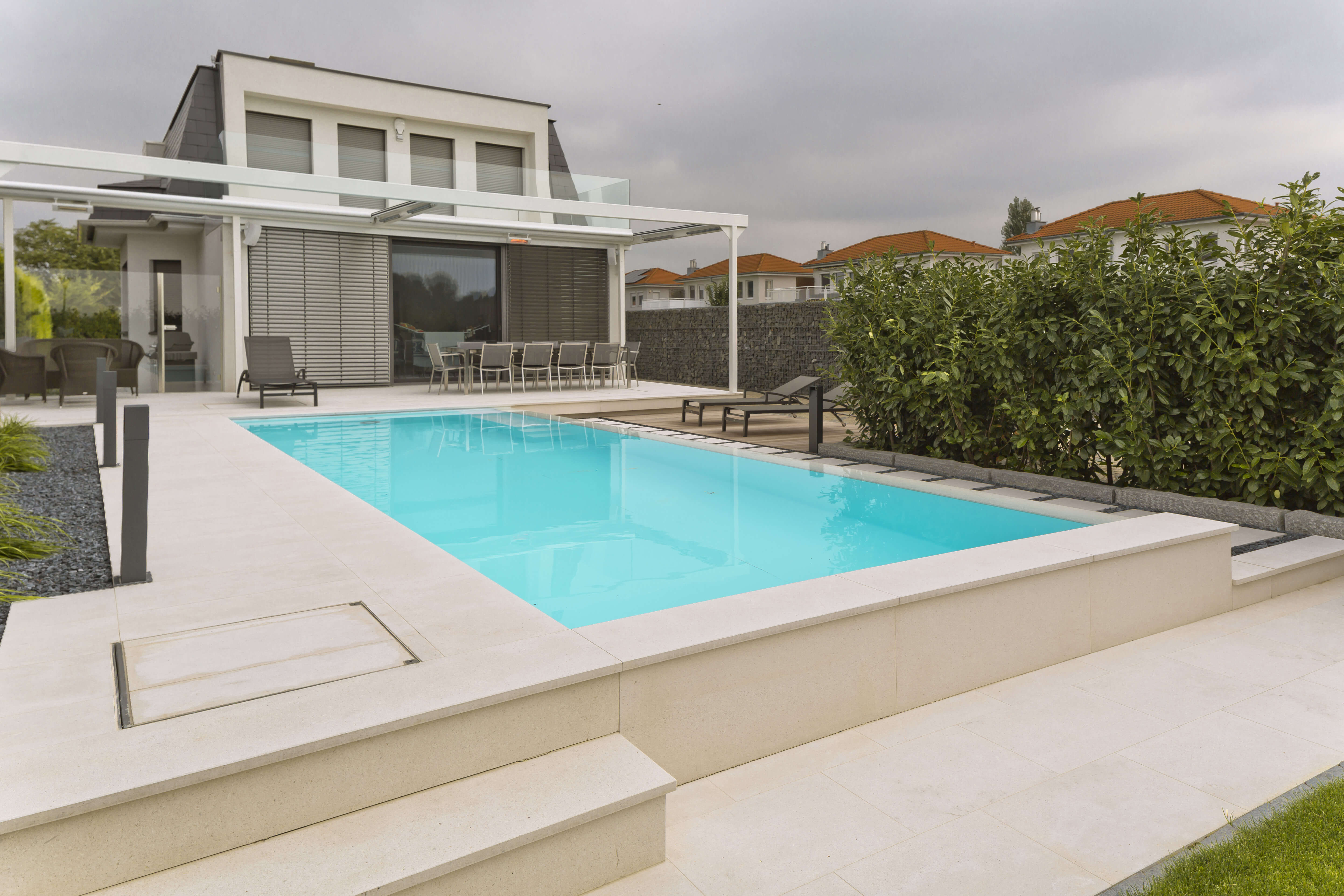 Auf einem Grundstück südlich von Wien gestalteten Schreiber & Partner mit beigem Kalkstein einen modernen Außenbereich. Die vor dem Wohnzimmer errichtete Terrasse und das Schwimmbecken grenzen direkt aneinander an; durch die Konzentration auf einen einzigen Naturstein bilden beide Bereiche eine harmonische Einheit.