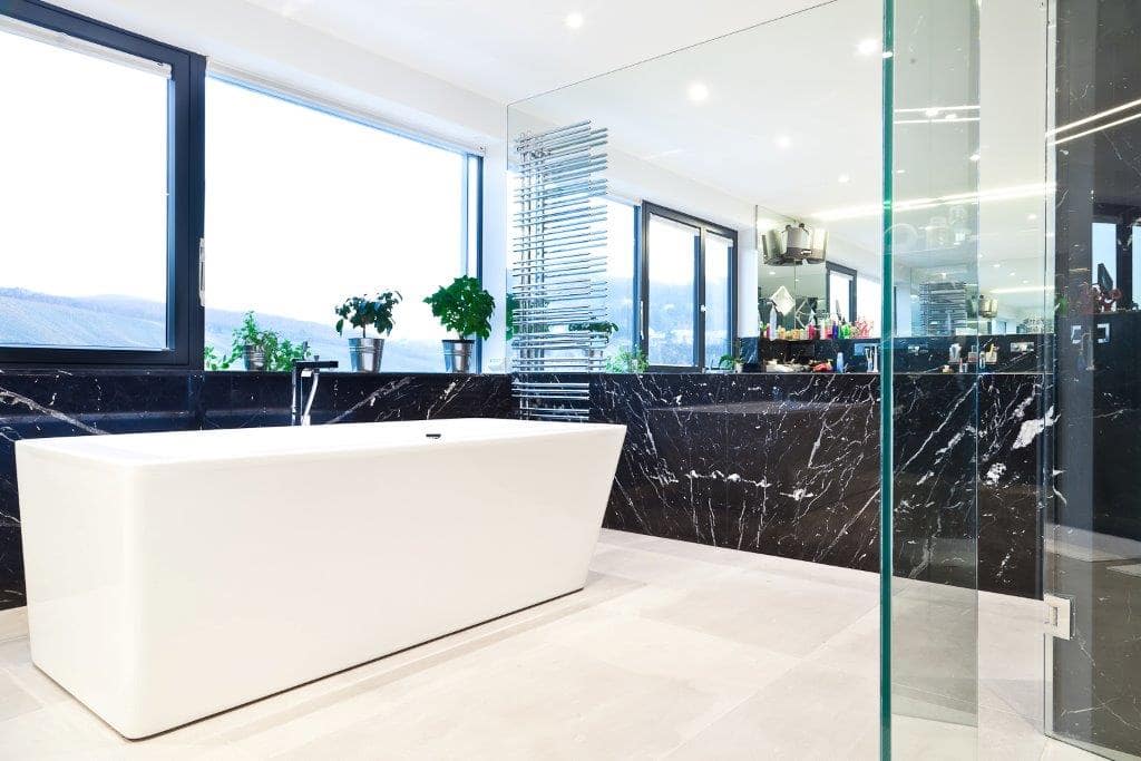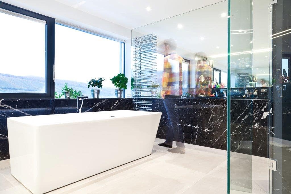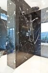Aus polierten Rohplatten kombiniert mit großformatigen Luna Grey Bodenplatten: Wie so oft hatten Bauherr und Baudame unterschiedliche Wünsche. Er wollte ein schwarzes, hochglanzpoliertes Bad in welchem sich die Weinberger der Umgebung spiegeln. Sie wollte ein helles, mattes Bad, rutschfest versteht sich. Er wollte zusätzlich auch noch eine rundum durchlaufende weiße Maserung. Eine wunderbare Herausforderung.....