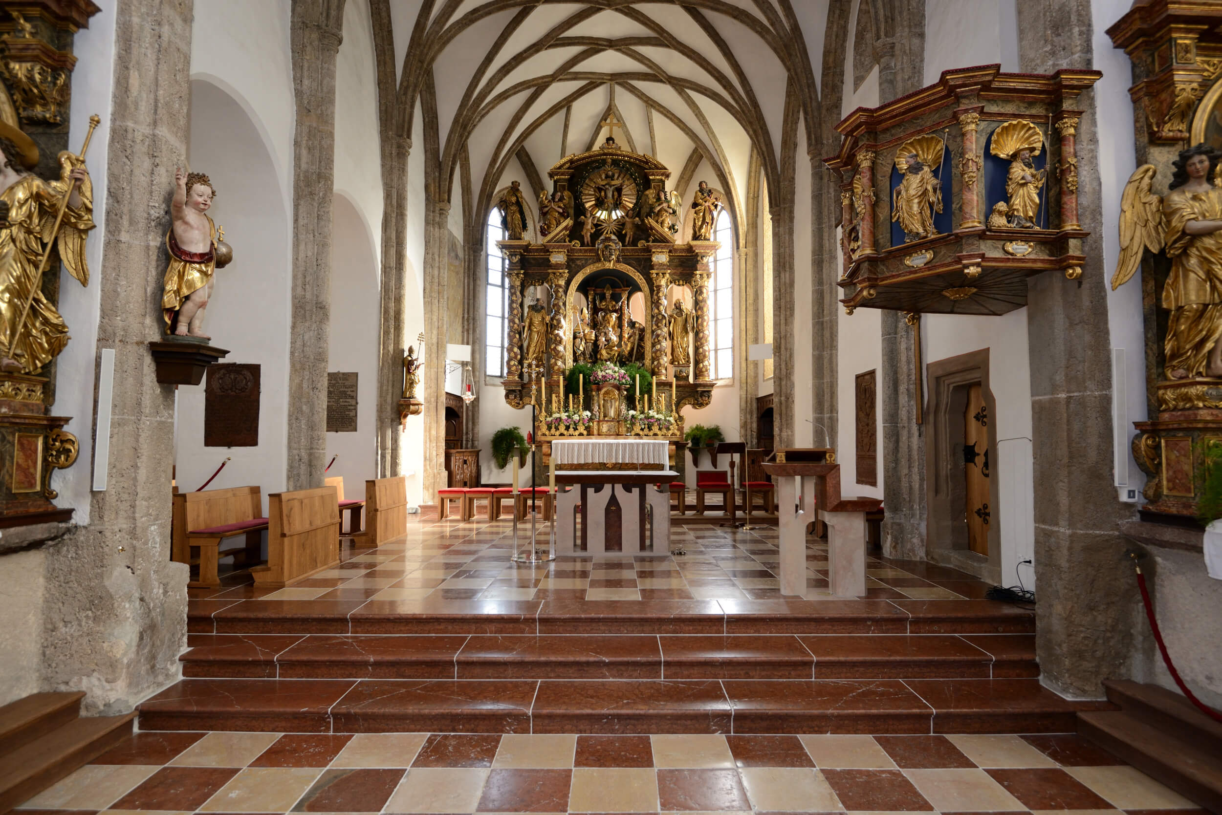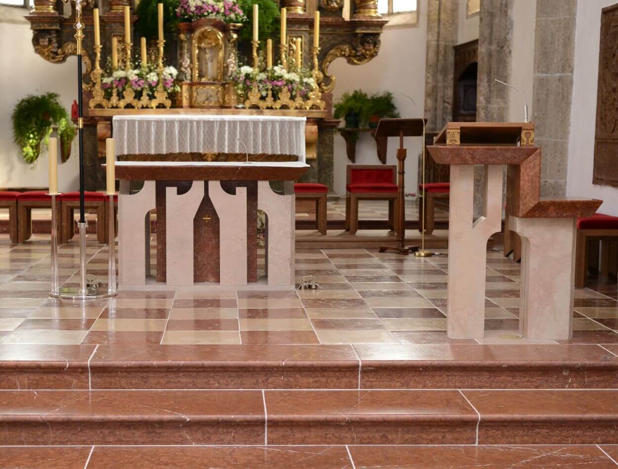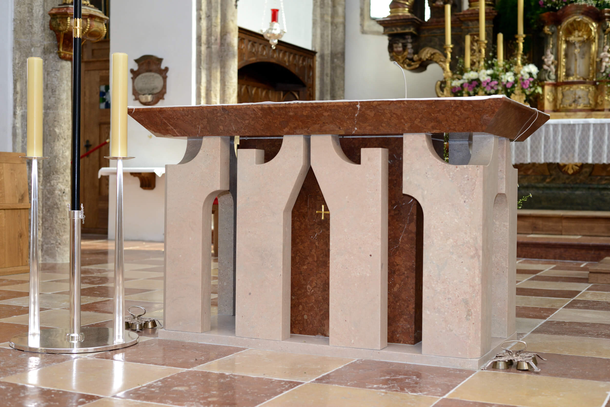 Die Pfarre Abtenau in Salzburg gehört zum Pfarrverband Lammertal und ist seit dem 16. Jahrhundert als Klosterpfarre des Stiftes St. Peter in Salzburg inkorporiert. Im Zuge der Sanierung wurde der Innenraum der Kirche teilweise umgestaltet und es kamen vielfältige Natursteinarbeiten zur Ausführung. Es sind sowohl Adneter Marmor als auch Untersberger Marmor in den farblich und strukturell passenden Ausprägung verwendet worden. Im neu gestalteten und vergrößerten Altarraum wurden ein neuer Volksaltar und ein neuer Ambo nach den Entwürfen des Architekten erarbeitet und versetzt. Beide Stücke stellen handwerklich hochstehende Steinmetzarbeiten dar und wurden im Juni 2016 nach Abschluss der Arbeiten feierlich eingeweiht.