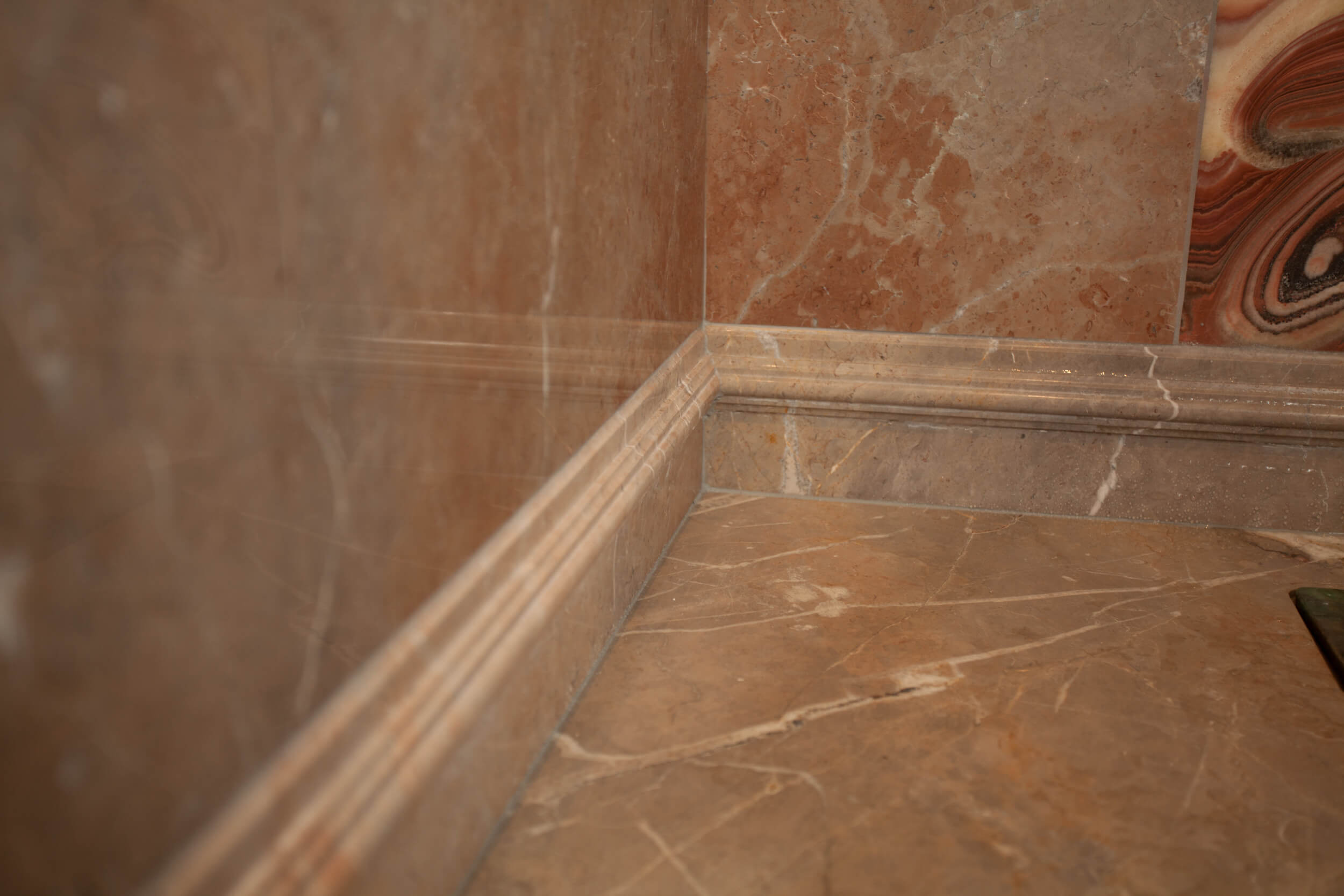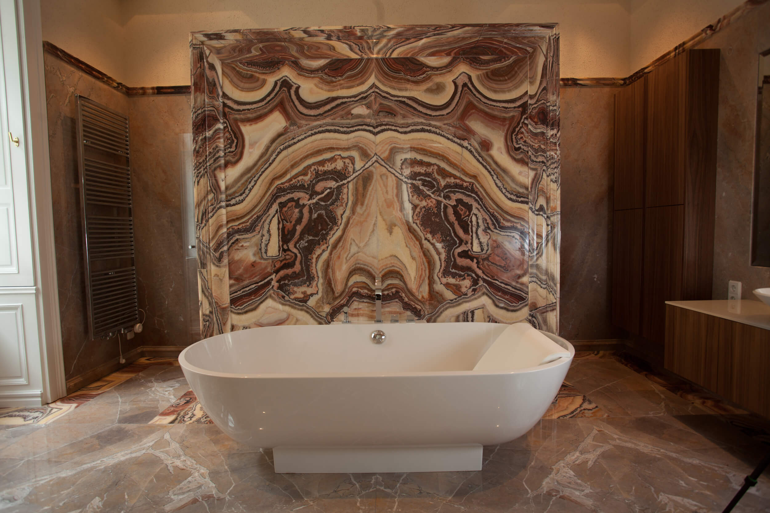 Ein Badesalon für die Tochter eines privaten Bauherrn im Stil italienischer Palazzi für eine Wiener Altbauwohnung. Alle Wandplatten aus wurden aus 2cm Kalkstein Etruscan Rosé gespiegelt geschnitten. Im Sockelbereich und als Umrahmung der Mauer hinter der Badewanne wurde ein Profil aus 2cm Platten in selber Sorte gefräst und versetzt zu einem massiv wirkenden Profil mit fortlaufender Maserung auf einem Blindmaterial zusammengekittet. Als Gesimsprofil wurde Onyx Nuvolato in 2cm Stärke versetzt verkittet. Am Boden läuft ein Onyx Nuvolato Fries den Wänden entlang. Die Duschtasse wurde aus einem Stück gefräst und verschliffen.