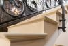 Um den Wunsch des Auftraggebers nach einer Prunkstiege in Keilstufenoptik in seiner Villa erfüllen zu können, wurde ein einfacher Stahlbetonstiegenlauf derart gefinkelt verkleidet, dass die einzelnen Stufen tatsächlich wie Keilstufen aussehen. Als Verkleidungsmaterial wurde Solnhofer Kalkstein ausgewählt. Die Fugen wurden farbich angepasst geschlossen und die Kanten vor Ort verschliffen. Dadurch wurde jede Stufe optisch zu einem einzelnen Gesamtelement. Bei den elliptischen Antrittstufen wurden die Setzstufen aus Einzelsegmenten verklebt, verschliffen und anschließend versetzt. In Kombination mit dem handgefertigten Schmiedeeisengeländer dominiert die Stiege, die über die zwei Geschosse reichende Eingangshalle und lädt zum Emporstein ein.