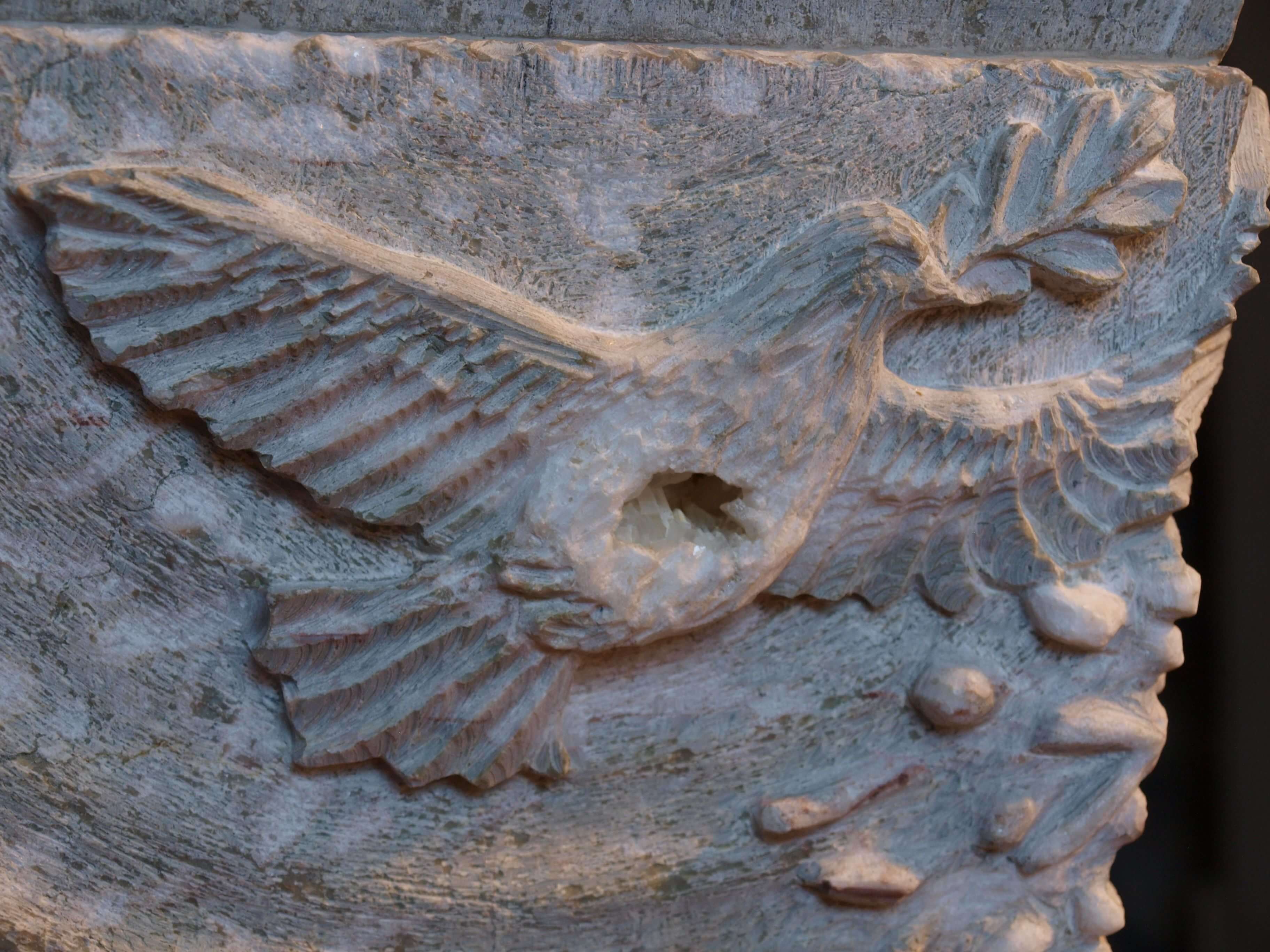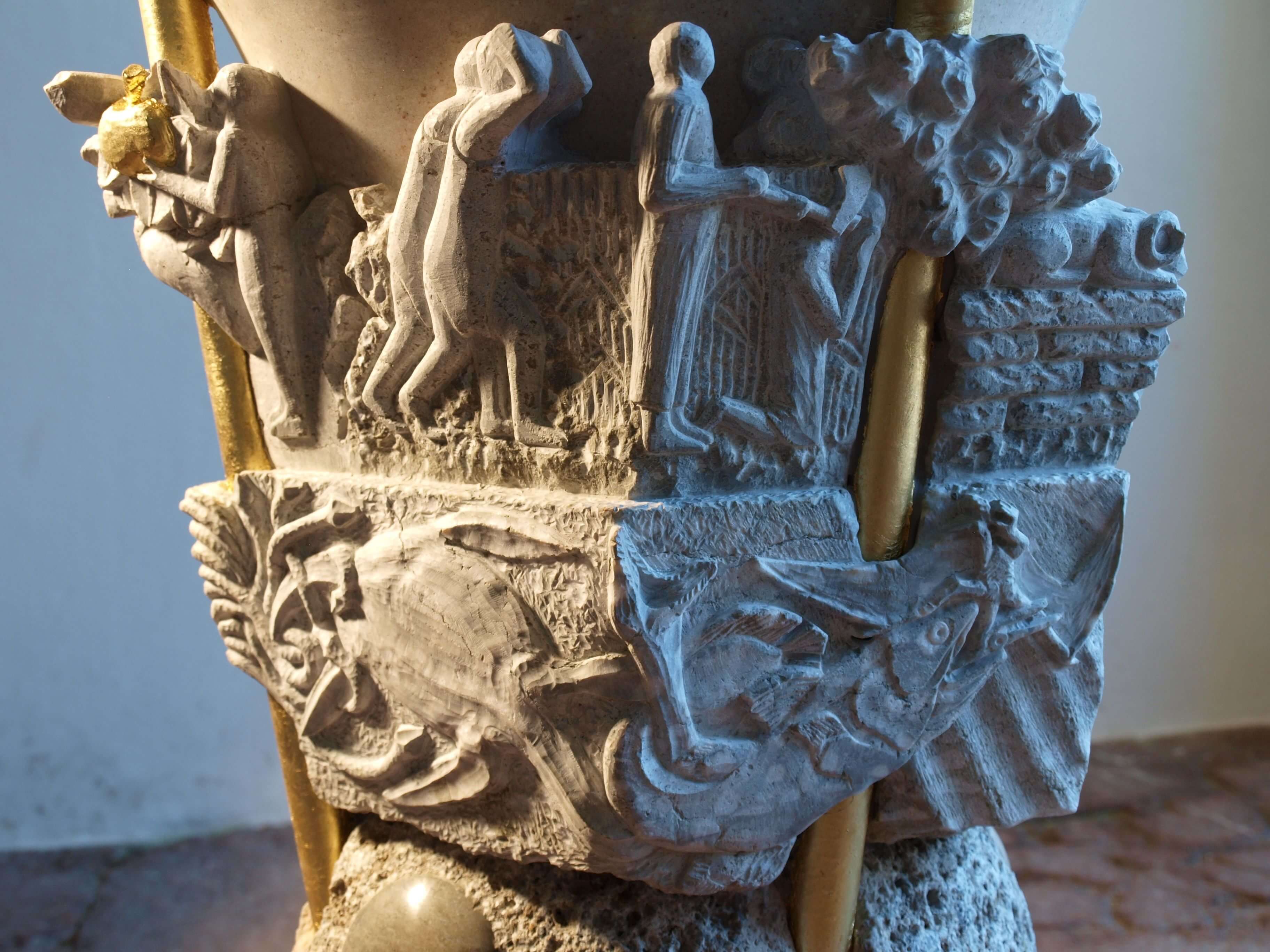 Wenn man beim Westportal ins Innere der Goiser Kirche kommt, laden zwei Gestühle zu beiden Seiten der Wand zum Verweilen, Betrachten und Beten ein. Der Taufstein in der Mitte besteht aus sieben aufbauenden Werksteinen und wird von drei vergoldeten Gestängen durchdrungen. Diese stehen für den DREIEINIGEN GOTT – die Steine für die Schöpfung, die GOTT in sechs „Tagen“ schuf. Am Siebten ruhte ER von seinem Tun.