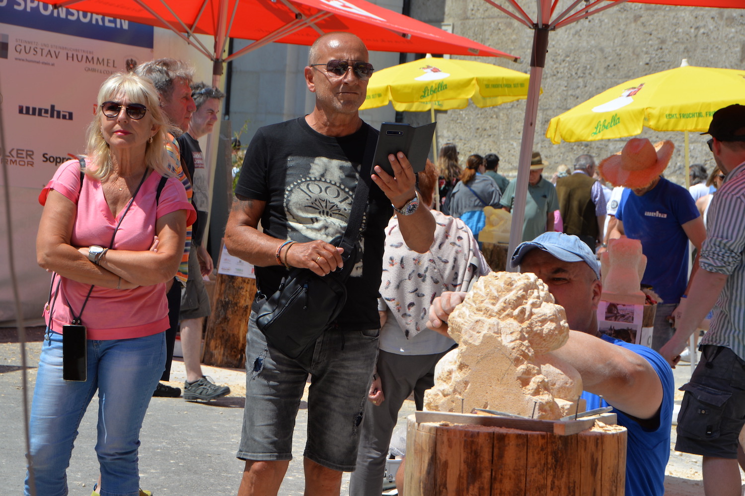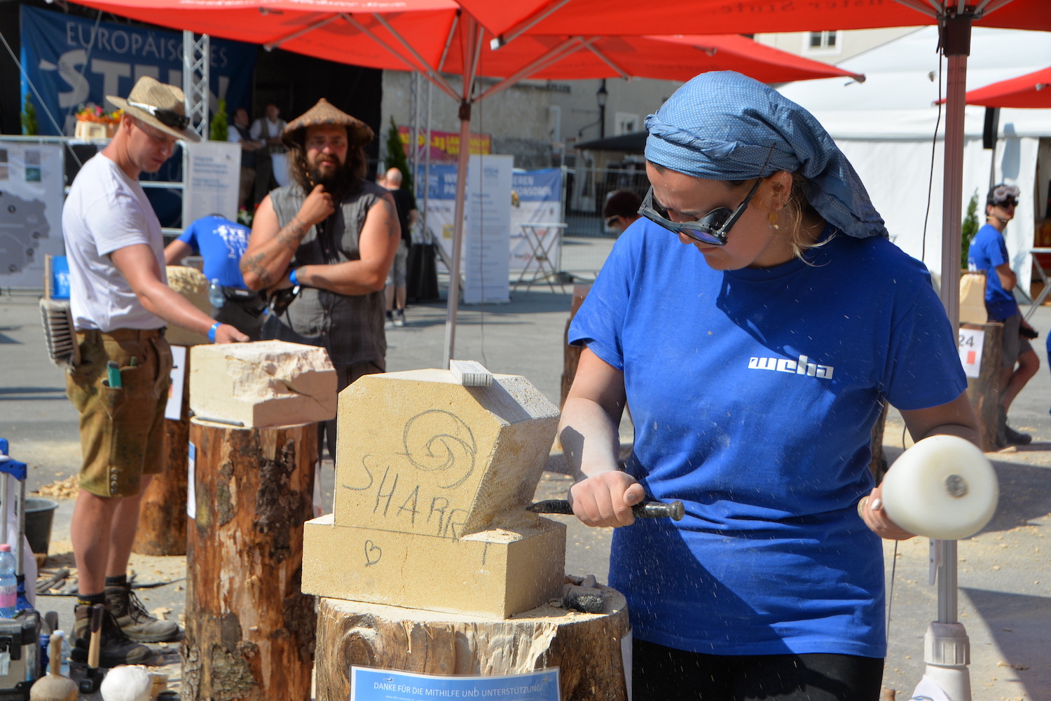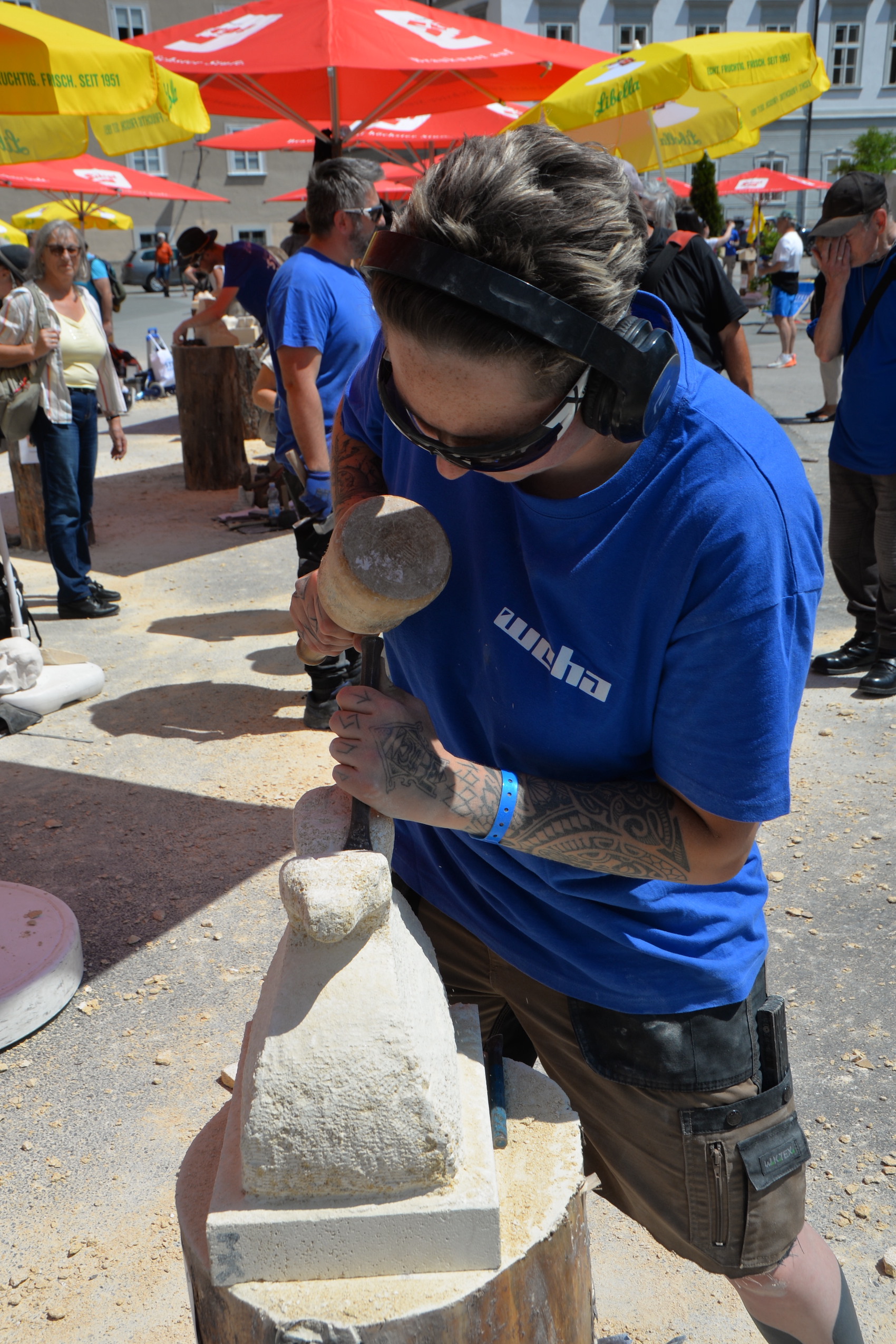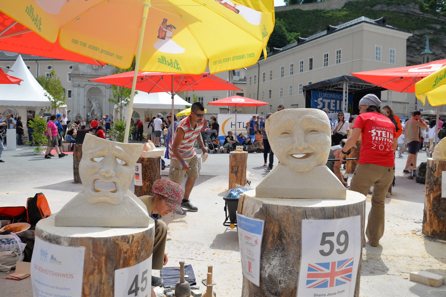 Am 03. und 04. Juni 2023 stand der Kapitelplatz in Salzburg ganz im Zeichen der Steinmetz-Kunst. Rund 110 Teilnehmende aus 12 verschiedenen Nationen demonstrierten live vor Ort ihr Können. Zahlreiche Besucher blickten begeistert den internationalen Steinmetzen und Bildhauern dabei über die Schulter, während diese im Wettbewerb ihre Skulpturen zum Thema „103 Jahre Salzburger Festspiele“ aus St. Margarethener Kalksandstein meißelten. Auch die Fachschule für Steintechnik und Steingestaltung der HTL Hallein feierte mit einer Präsentation von Designprojekten ihr 125-jähriges Bestehen im Zuge des Steinfestivals und stellte ihre Ausbildungsschwerpunkte vor. Beeindruckend war der Klang von über hundert hämmernden und meißelnden Steinmetzen im Herzen der Salzburger Altstadt.