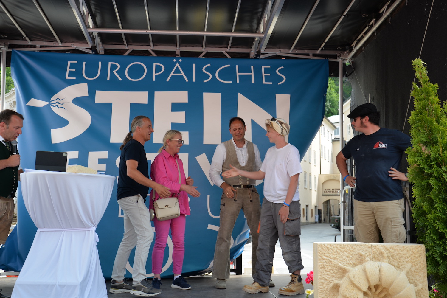Im Rahmen einer feierlichen Eröffnung durfte der Moderator Georg Pollak mehrere Festredner auf der Bühne des Steinfestivals begrüßen. Dr. Elisabeth Kandler-Mayr, Ordinariatskanzlerin der Erzdiözese Salzburg ging auf die Verflechtung und Tradition von Naturstein und Kultur in Salzburg ein und Landesrätin Mag. Daniela Gutschi freute sich über das „Klingen des Steins im so steinreichen Salzburg“. Norbert Kienesberger, Bundesinnungsmeister-Stv. der Steinmetze Österreichs richtete Grußworte an alle nationalen und internationalen Gäste des Festivals und Veranstaltungs-Initiator Helmut Moser hatte schließlich die Ehre allen Teilnehmer ein zünftiges „Glück auf!“ zu wünschen.