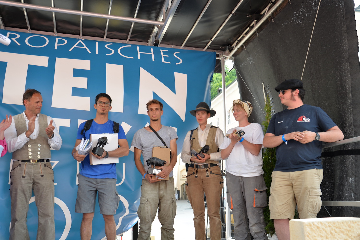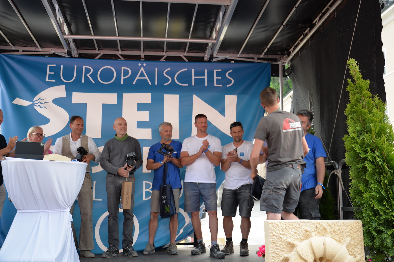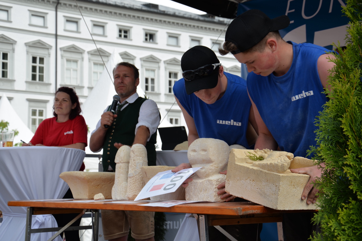 Bei dem über zwei Tage gehenden Bewerb der Steinmetze galt es, das vorgegebene Motto „103 Jahre Salzburger Festspiele“ in einem Objekt aus St. Margarethener Kalksandstein umzusetzen, ganz nach eigenen Ideen und Konzepten. Delegationen aus Deutschland, Frankreich und Ungarn begleiteten die Teilnehmer und bewunderten ihre Arbeit. Dr. Gerd Merke, Generalsekretär der EUROROC, betonte die europäische Dimension dieser Veranstaltung. Sowohl ihm als auch dem Europäischen Steinfestival ist es ein Anliegen, die Nachhaltigkeit von Naturstein als Baumaterial zu vermitteln.“ Nach Abschluss der Arbeiten schritt eine fachkundige, internationale Jury zur Begutachtung und Beurteilung der einzelnen Werkstücke. Jury-Mitglied Bernhard Hasenöhrl (Steinmetzmeister und Euro/Worldskills-Trainer) freute sich über das hohe handwerkliche Niveau der präsentierten Arbeiten. Martin Schmeiser (Steinmetzmeister und Jury-Mitglied) erklärte, dass zahlreiche Durchgänge und gemeinsame Gespräche in der Jury zur Prämierung der Siegerarbeiten notwendig sind. Auch Norbert Stoffel (Jury Mitglied und Präsident EASMS Frankreich) war positiv überrascht von den vielen kreativen und hochwertigen Projekten. Zusammen mit Gabriella Csanadi (Landesinnungsmeister-Stv. Ungarn) und Norbert Kienesberger wurden schließlich die Preisträger in den Kategorien Lehrling, Geselle, Meister und Gruppenarbeit festgelegt.