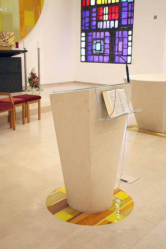 Der Entwurf vom Künstler Mag. Heinz Ebner lautet „Wandlung - aus Alt wird Neu, aus Eckig wird Rund“ – das spiegelt sich bei den Formen des Altars, Ambos und Taufbeckens wider. Der Altar hat eine elliptische Form und verjüngt sich auf eine rechteckige Standfläche. Der Ambo mit seiner rechteckigen Form geht in eine kreisförmige Standfläche über und das Taufbecken verjüngt sich mit seiner Kreisform zu einer dreieckigen Standfläche. Die Rohlinge wurden mit einer Brückensäge gefertigt und die finale Formgebung erfolgte durch Handarbeit.