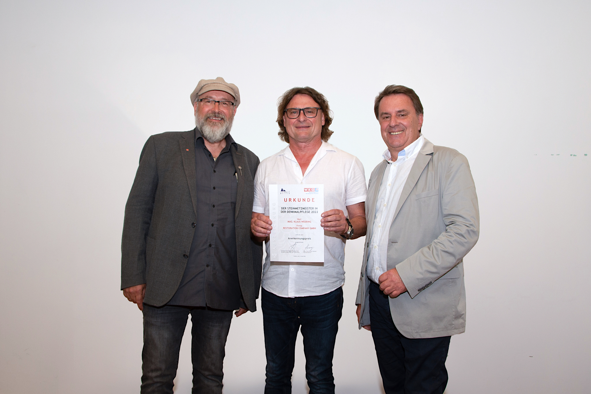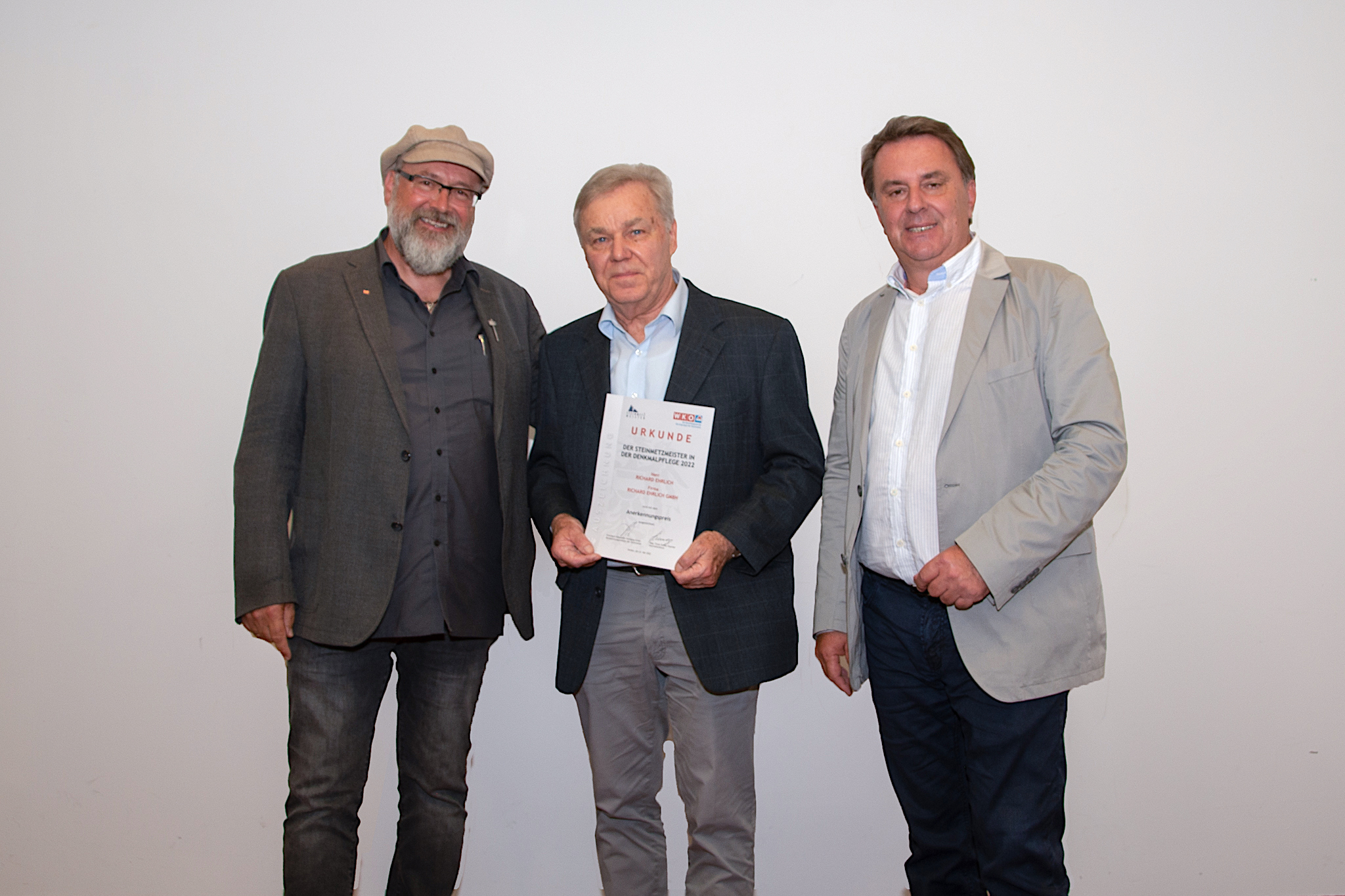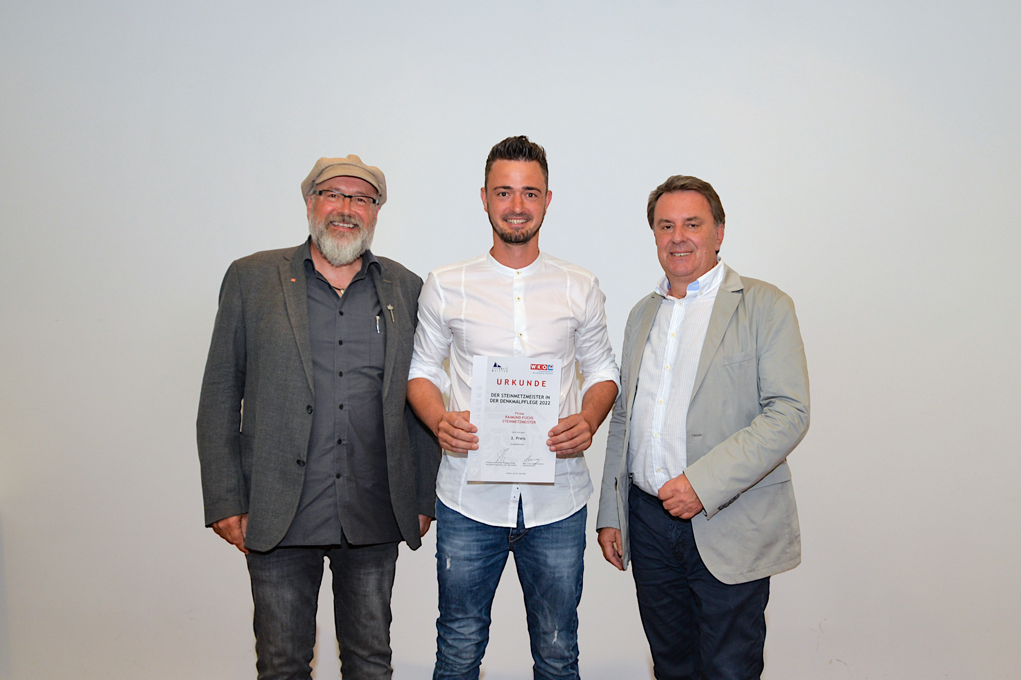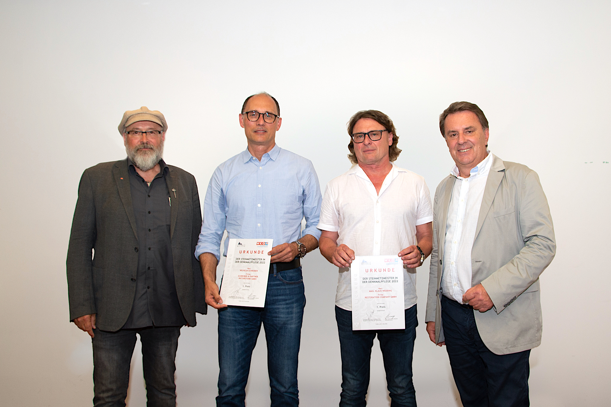 Im Bereich Denkmalpflege spielen Steinmetze eine große Rolle – entsprechend begehrt ist der „Denkmalpflege-Preis“, für welchen es dieses Jahr sogar zwei Sieger gab. Mit den arbeitsaufwendigen Restaurierungsarbeiten am Marien-Dom in Linz (rund 18.000 Arbeitsstunden durch Gerhard Fraundorfer in St. Martin im Mühlkreis) und der Sanierung der Poysdorfer Pestsäule (durch Restoration Company und Schreiber & Partner Natursteine) zeigt die Steinmetz-Branche auf beeindruckende Art und Weise ihren erheblichen Anteil an der Erhaltung österreichischer Kulturdenkmäler. Der 3. Platz ging an Raimund Fuchs aus Bergheim/ Salzburg für seine umfassenden Arbeiten an der „Pfarrkirche Arnsdorf“.
