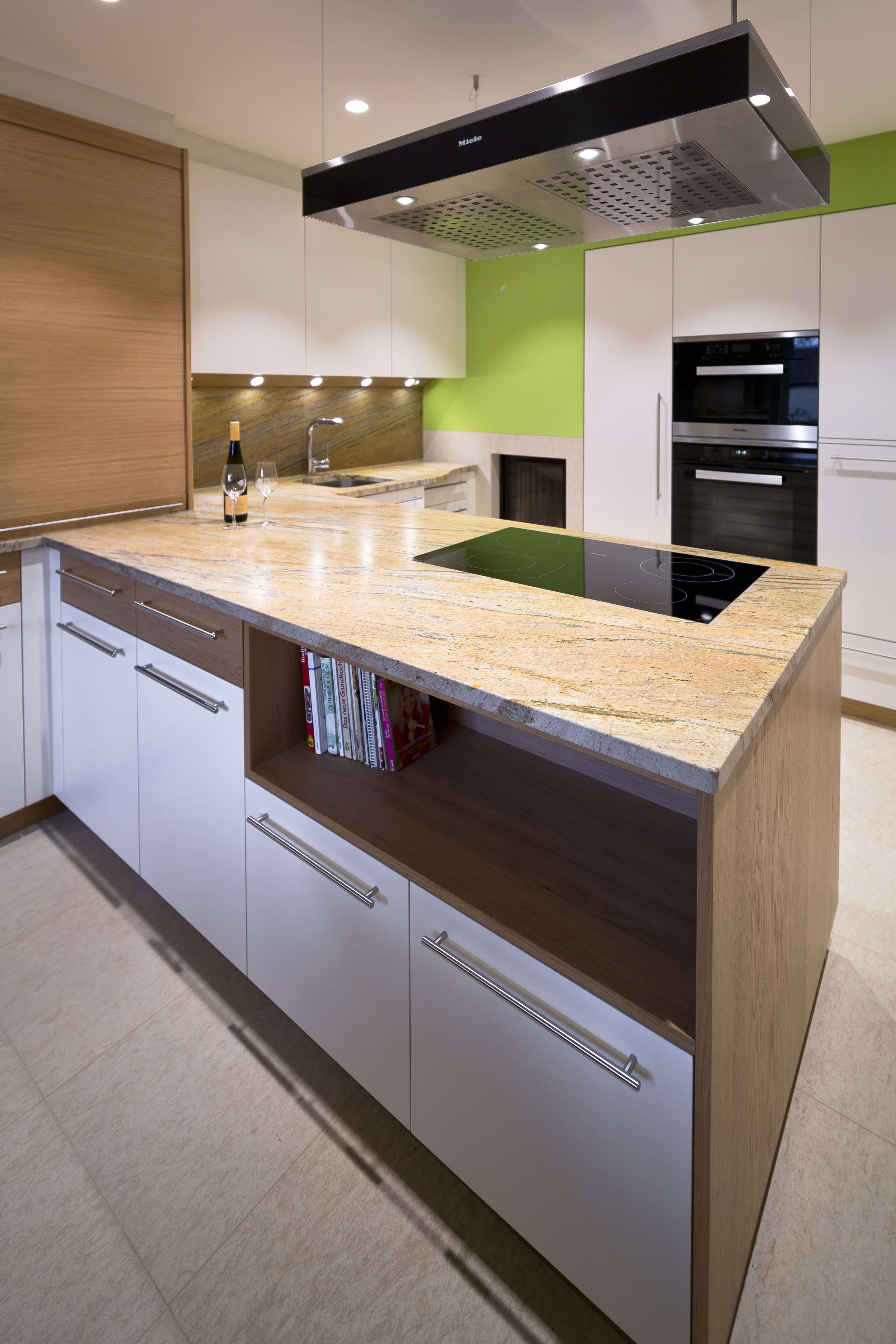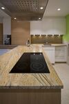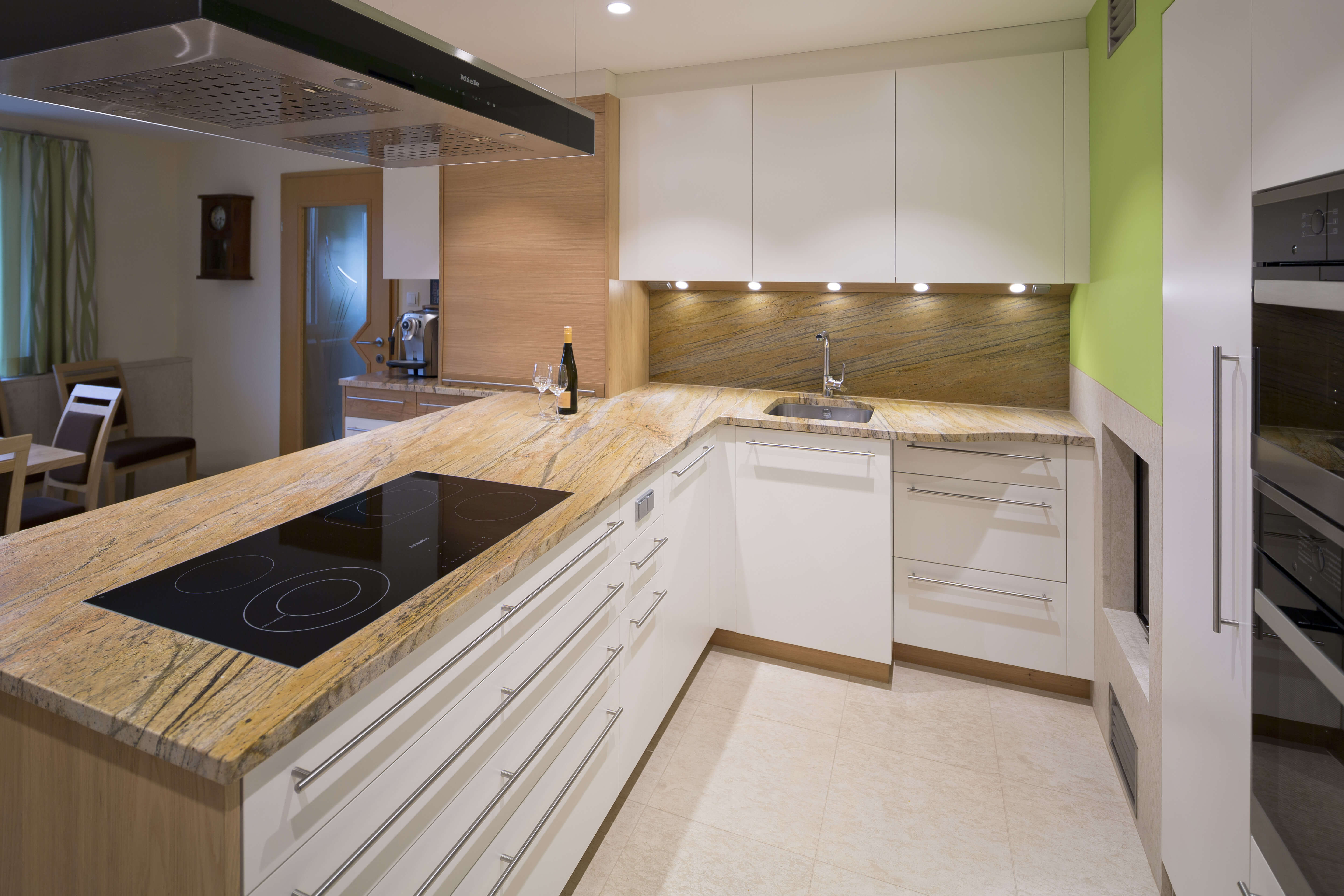 In einem Privathaus im Weinviertel sollte die bestehende Küche durch ein modernes Ambiente mit Naturstein ersetzt werden. Bei der Gestaltung setzten Schreiber & Partner Küche auf die freundliche, helle Wirkung von Praha Gold. Die 3 cm starken Platten sind gebürstet. Im Gegensatz zu polierten Platten lässt diese samtig schimmernde, leicht strukturierte Oberflächenbearbeitung die Arbeitsplatten besonders natürlich wirken. Die Rückwand mit den integrierten Elektrogeräten steht dazu in einem klaren Kontrast, ohne die optische Wirkung der Steinplatten zu beeinträchtigen. In die Rückwand ist ebenfalls ein mit Kalkstein bekleideter Kamin eingebaut, der die wohnliche Atmosphäre des Raums unterstreicht. Der aus demselben Material gefertigte Kalksteinboden bildet die entspannte Basis des Raumes. Das von einem Lichtplaner entworfene Beleuchtungskonzept wirft ein ausgewogenes Licht auf die gesamte Szenerie.