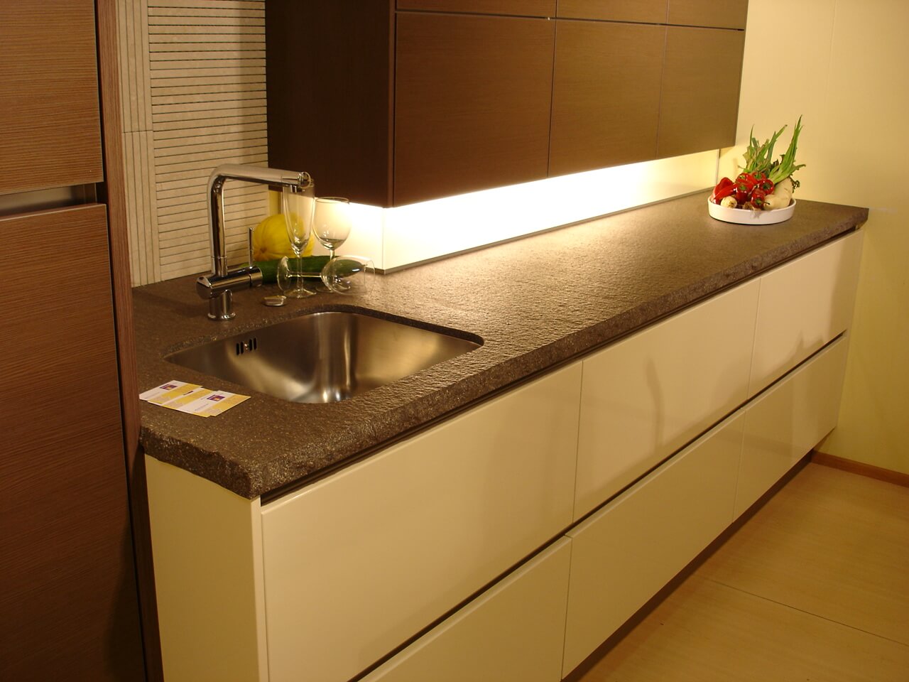 Bei diesen Küchenarbeitsplatten für eine Familie aus St. Leonhard am Forst wurde „Porphyr“ aus Patagonien verwendet. Stärke 4 cm, Oberfläche geflammt und gebürstet, Sichtkantenbearbeitung mit Bruchkante abgefast und gebürstet. Herdausschnitt flächenbündig, Spülenausschnitte abgestärkt auf 15 mm, Schnittfläche abgefast geschliffen und gebürstet. Steinkanten bündig mit den Fronten des Unterbaues.
