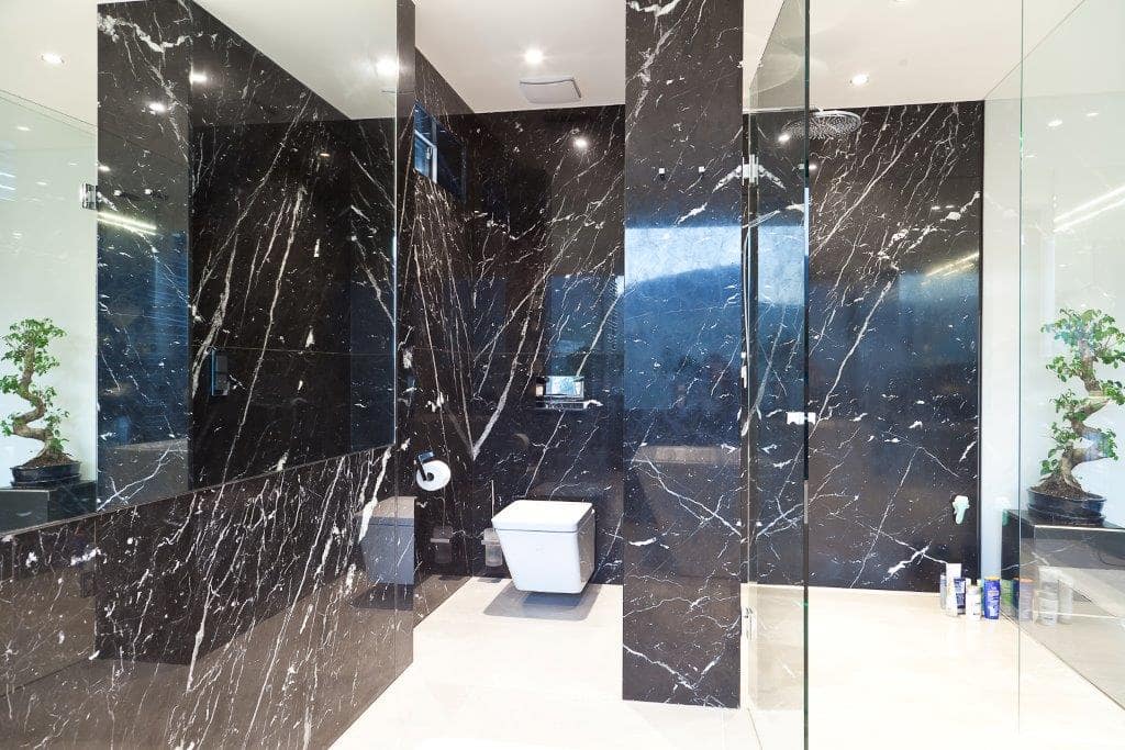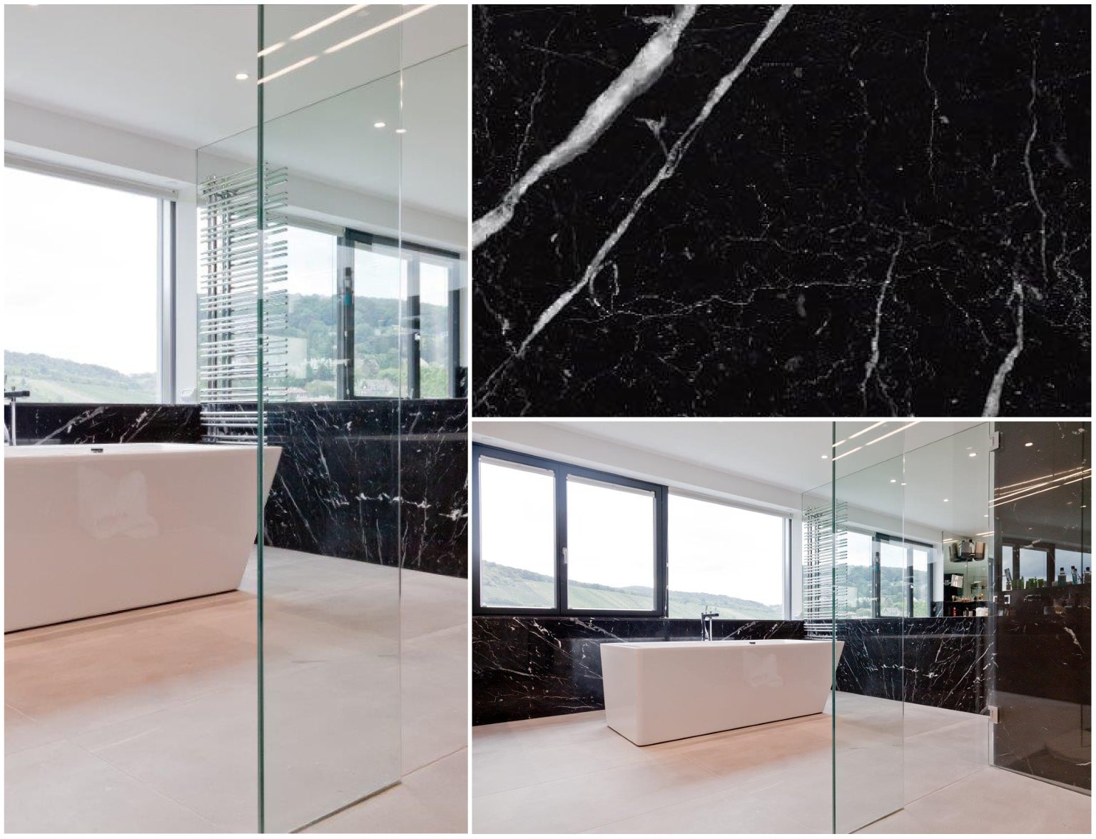 Aus polierten Rohplatten kombiniert mit großformatigen Luna Grey Bodenplatten: Wie so oft hatten Bauherr und Baudame unterschiedliche Wünsche. Er wollte ein schwarzes, hochglanzpoliertes Bad in welchem sich die Weinberger der Umgebung spiegeln. Sie wollte ein helles, mattes Bad, rutschfest versteht sich. Er wollte zusätzlich auch noch eine rundum durchlaufende weiße Maserung. Eine wunderbare Herausforderung.....