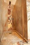 Zuschnitt Wand- und Bodenplatten, Duschtasse, Produktion Sockel, Gesims und Profil für Trennwand durch Steinmetzmeisterbetrieb SCHUBERT STEINZENRUM GmbH. Verlegung des gesamten Bades durch Steinmetzmeister Trinkl GmbH