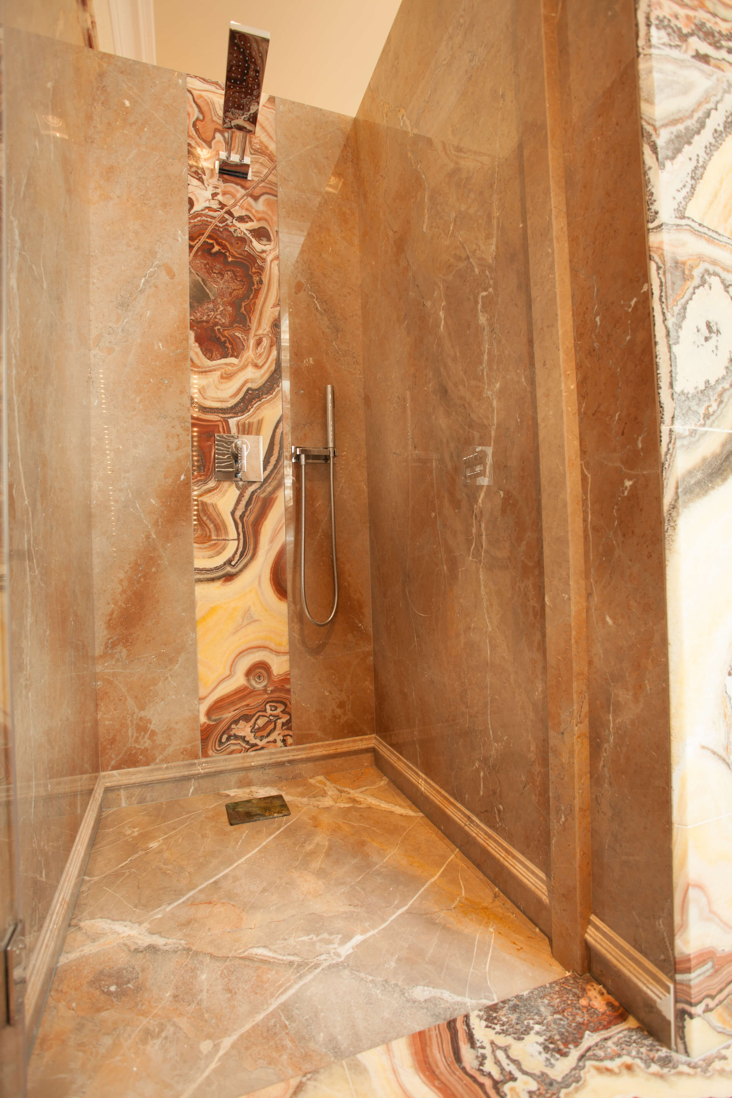 Ein Badesalon für die Tochter eines privaten Bauherrn im Stil italienischer Palazzi für eine Wiener Altbauwohnung. Alle Wandplatten aus wurden aus 2cm Kalkstein Etruscan Rosé gespiegelt geschnitten. Im Sockelbereich und als Umrahmung der Mauer hinter der Badewanne wurde ein Profil aus 2cm Platten in selber Sorte gefräst und versetzt zu einem massiv wirkenden Profil mit fortlaufender Maserung auf einem Blindmaterial zusammengekittet. Als Gesimsprofil wurde Onyx Nuvolato in 2cm Stärke versetzt verkittet. Am Boden läuft ein Onyx Nuvolato Fries den Wänden entlang. Die Duschtasse wurde aus einem Stück gefräst und verschliffen.
