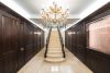 Um den Wunsch des Auftraggebers nach einer Prunkstiege in Keilstufenoptik in seiner Villa erfüllen zu können, wurde ein einfacher Stahlbetonstiegenlauf derart gefinkelt verkleidet, dass die einzelnen Stufen tatsächlich wie Keilstufen aussehen. Als Verkleidungsmaterial wurde Solnhofer Kalkstein ausgewählt. Die Fugen wurden farbich angepasst geschlossen und die Kanten vor Ort verschliffen. Dadurch wurde jede Stufe optisch zu einem einzelnen Gesamtelement. Bei den elliptischen Antrittstufen wurden die Setzstufen aus Einzelsegmenten verklebt, verschliffen und anschließend versetzt. In Kombination mit dem handgefertigten Schmiedeeisengeländer dominiert die Stiege, die über die zwei Geschosse reichende Eingangshalle und lädt zum Emporstein ein.