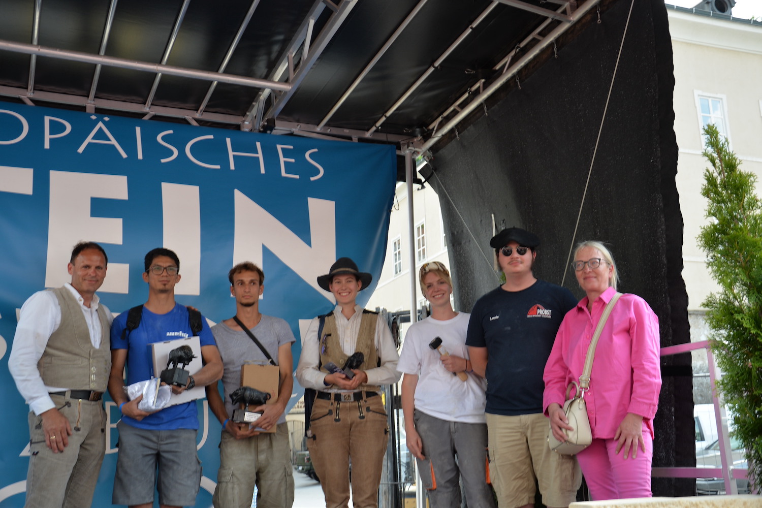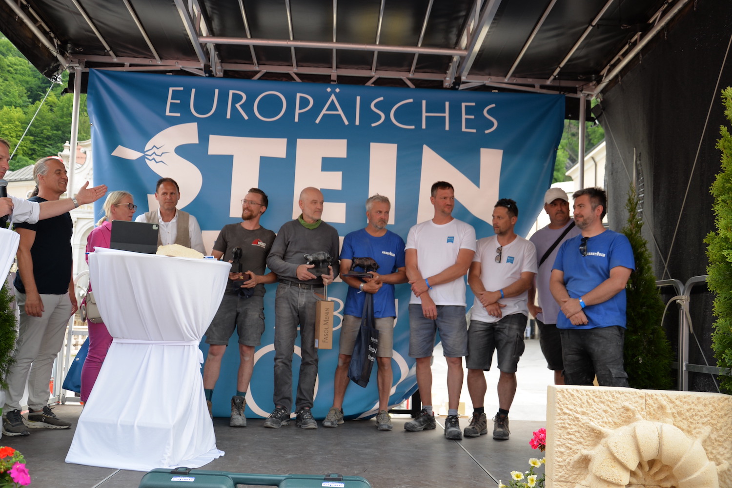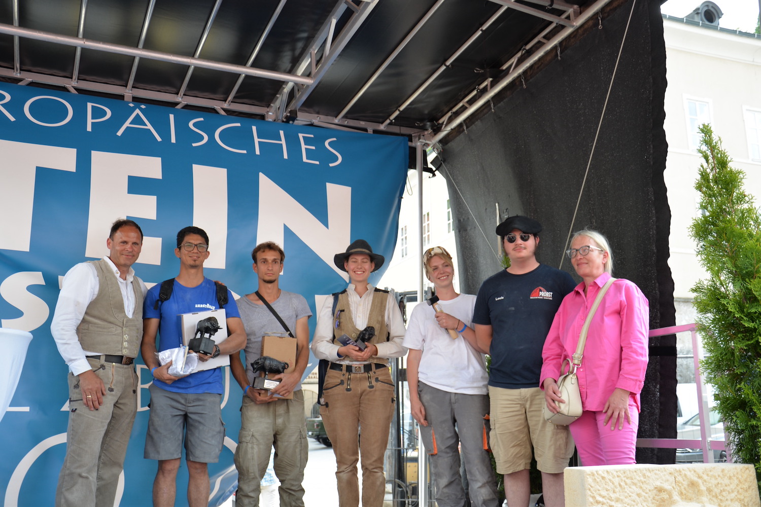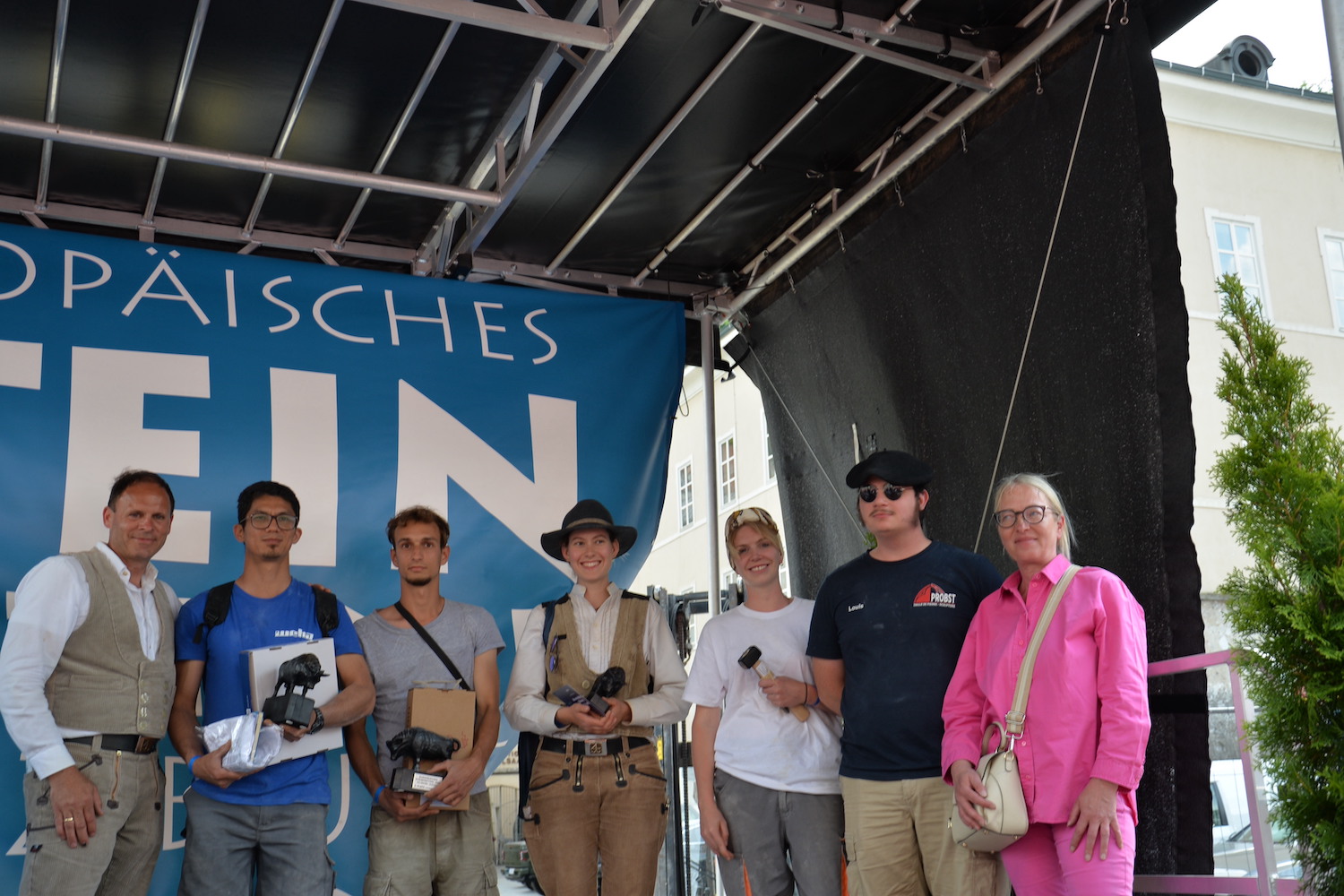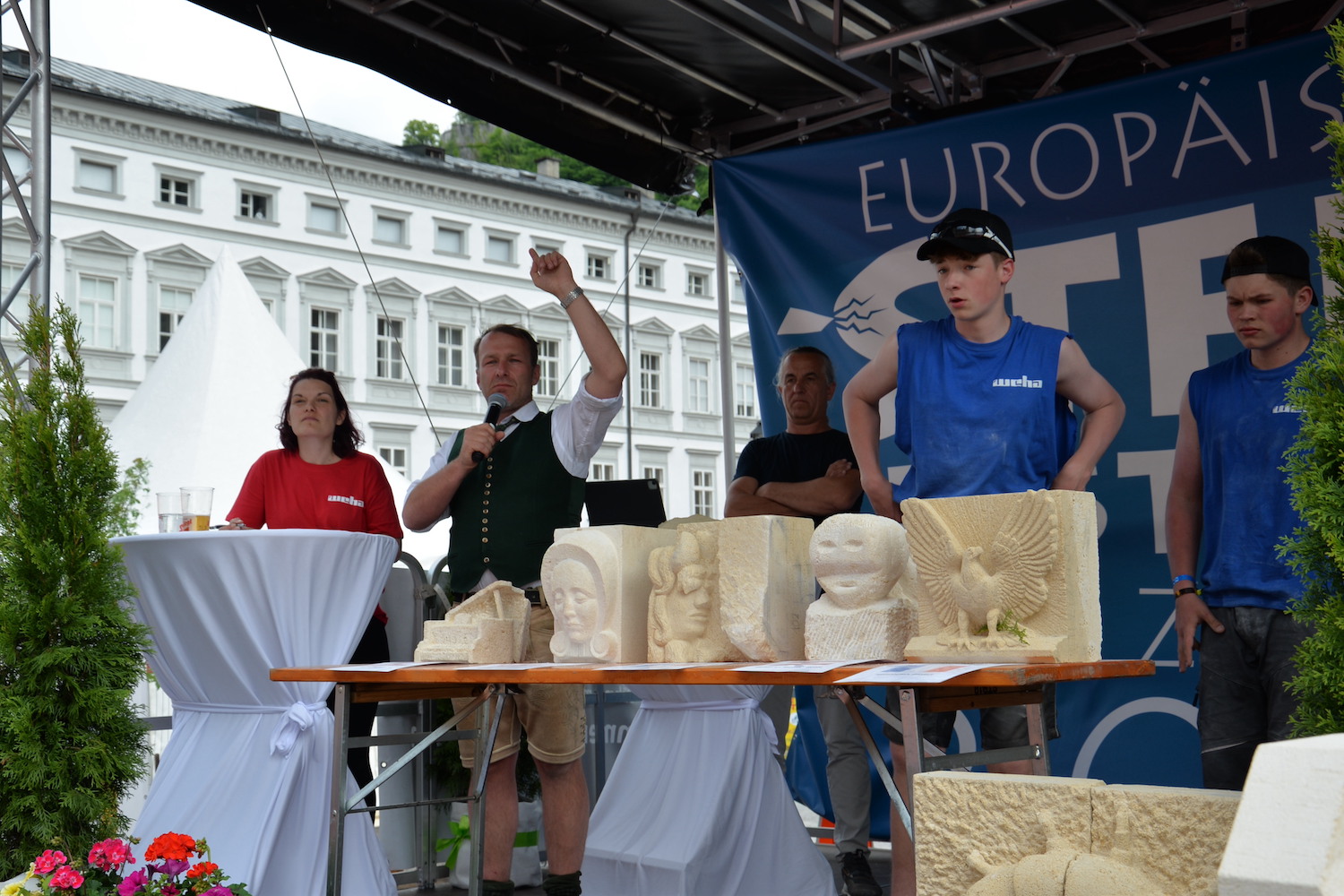 Bei dem über zwei Tage gehenden Bewerb der Steinmetze galt es, das vorgegebene Motto „103 Jahre Salzburger Festspiele“ in einem Objekt aus St. Margarethener Kalksandstein umzusetzen, ganz nach eigenen Ideen und Konzepten. Delegationen aus Deutschland, Frankreich und Ungarn begleiteten die Teilnehmer und bewunderten ihre Arbeit. Dr. Gerd Merke, Generalsekretär der EUROROC, betonte die europäische Dimension dieser Veranstaltung. Sowohl ihm als auch dem Europäischen Steinfestival ist es ein Anliegen, die Nachhaltigkeit von Naturstein als Baumaterial zu vermitteln.“ Nach Abschluss der Arbeiten schritt eine fachkundige, internationale Jury zur Begutachtung und Beurteilung der einzelnen Werkstücke. Jury-Mitglied Bernhard Hasenöhrl (Steinmetzmeister und Euro/Worldskills-Trainer) freute sich über das hohe handwerkliche Niveau der präsentierten Arbeiten. Martin Schmeiser (Steinmetzmeister und Jury-Mitglied) erklärte, dass zahlreiche Durchgänge und gemeinsame Gespräche in der Jury zur Prämierung der Siegerarbeiten notwendig sind. Auch Norbert Stoffel (Jury Mitglied und Präsident EASMS Frankreich) war positiv überrascht von den vielen kreativen und hochwertigen Projekten. Zusammen mit Gabriella Csanadi (Landesinnungsmeister-Stv. Ungarn) und Norbert Kienesberger wurden schließlich die Preisträger in den Kategorien Lehrling, Geselle, Meister und Gruppenarbeit festgelegt.